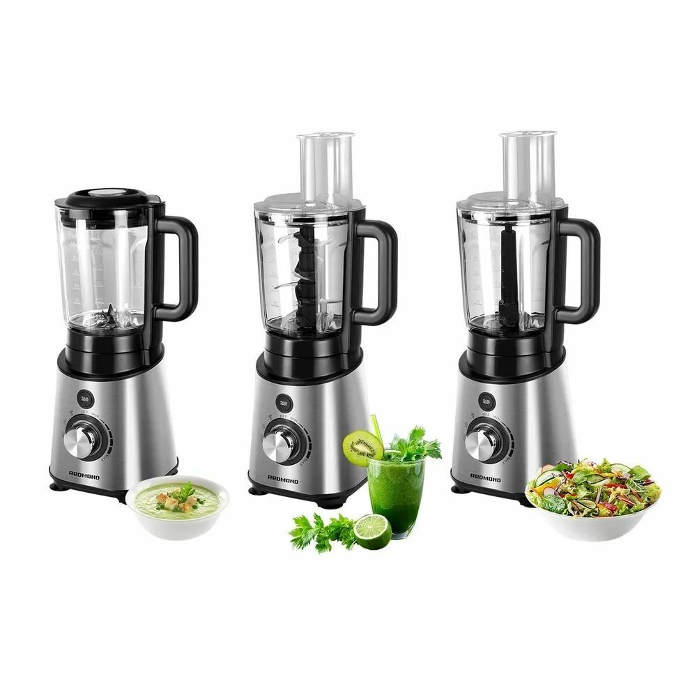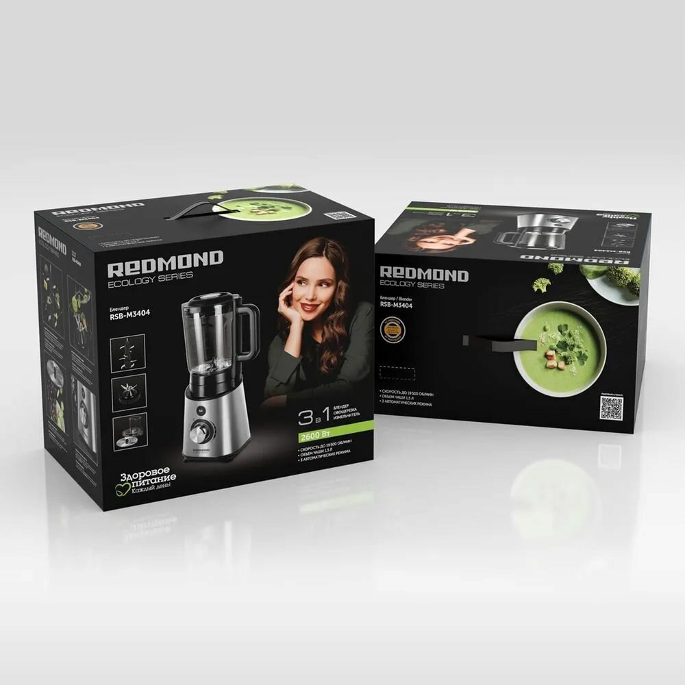 | Прочие свойства и особенности | REDMOND RSB-M3404 поможет вам быстро подготовить ингредиенты для любимых блюд. Устройство работает как стационарный блендер, измельчитель и овощерезка. , 3 автоматических программы:, Режим 1 — для колки льда, измельчения орехов, твердого сыра, замороженных ягод;, Режим 2 — для взбивания сливок и яиц, приготовления кремов, молочных коктейлей, фруктовых и овощных пюре;, Режим 3 — импульсный. Работает короткими включениями, что позволяет лучше контролировать процесс измельчения и смешивания супов-пюре, смузи, соусов. |