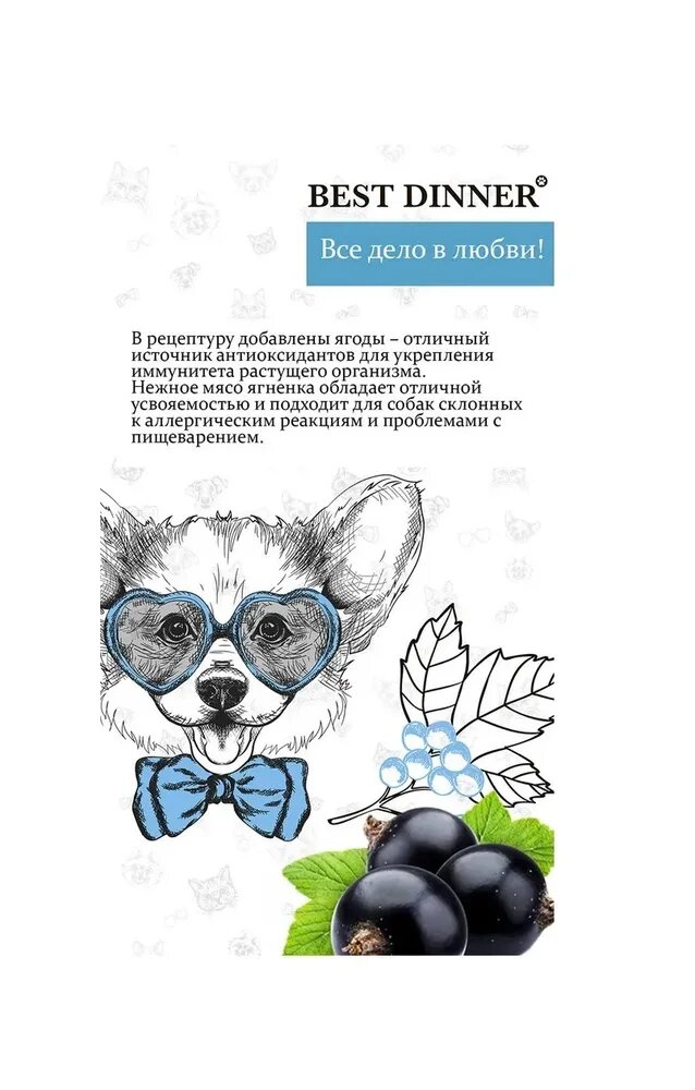 Высококачественный полнорационный корм супер-премиум класса для щенков всех пород с 1 месяца, беременных и кормящих собак Best Dinner с ягненком и ягодами создан специально для собак с особыми потребностями. В рецептуру добавлены ягоды – отличный источник антиоксидантов для укрепления иммунитета растущего организма, а также хондропротекторы, необходимые для правильного роста и развития опорно-двигательной системы. Нежное мясо ягненка обладает отличной усвояемостью и подходит для собак склонных к аллергическим реакциям и проблемами с пищеварением.