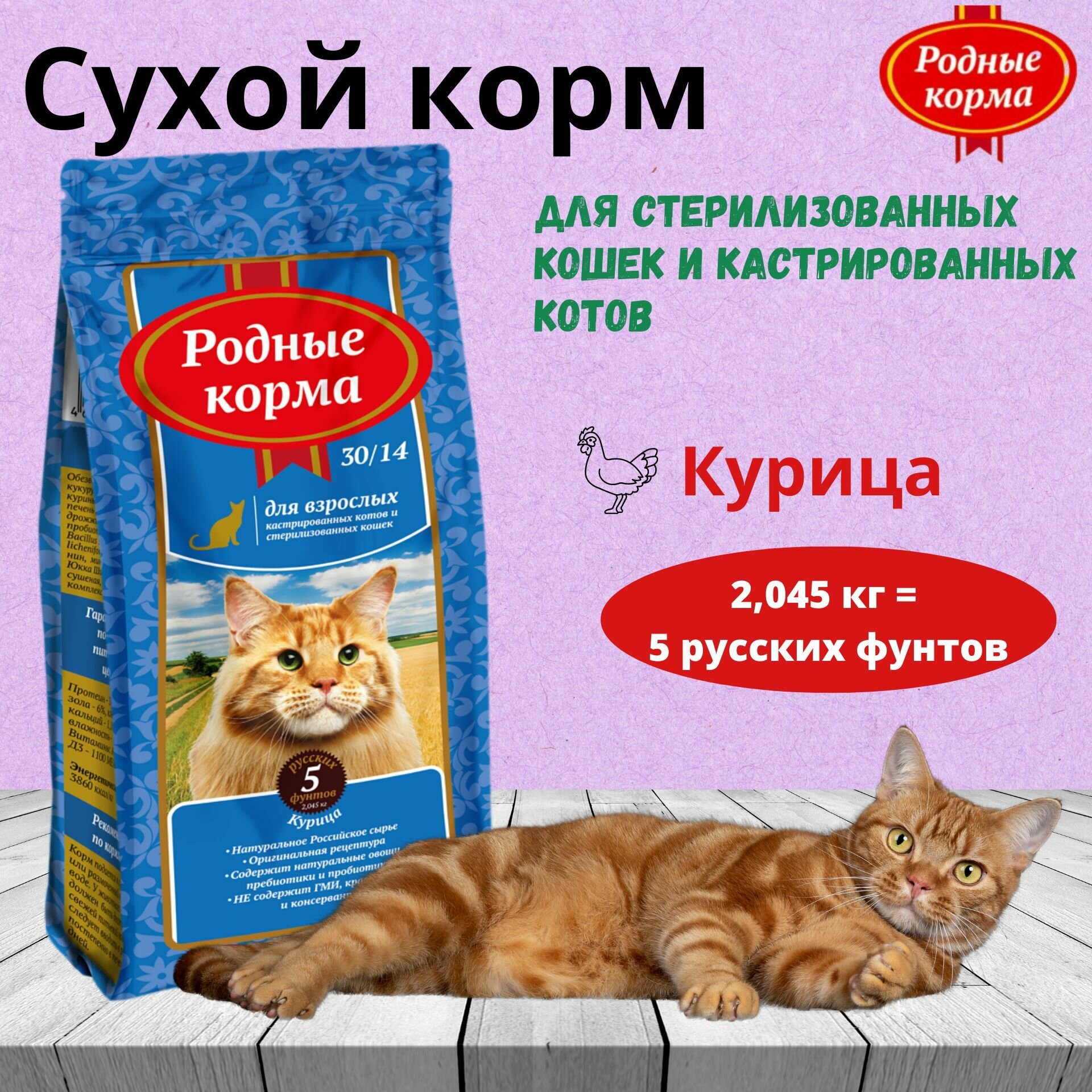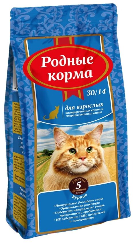 Сухой полнорационный корм премиум-класса для взрослых стерилизованных кошек и кастрированный котов Родные корма. Изготовлен с учетом их физиологических потребностей. В составе только натуральное российское сырье без ГМО, красителей и консервантов.