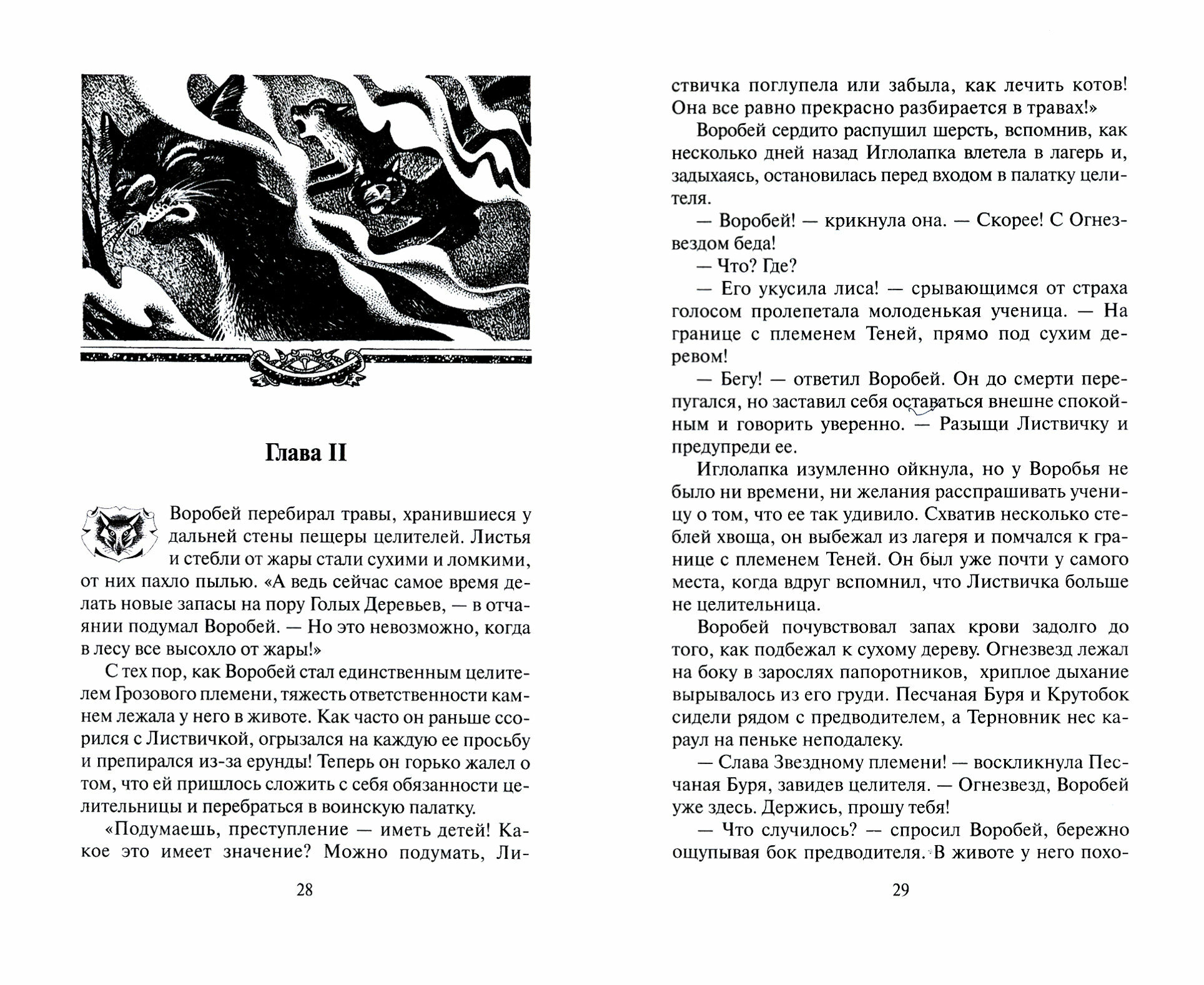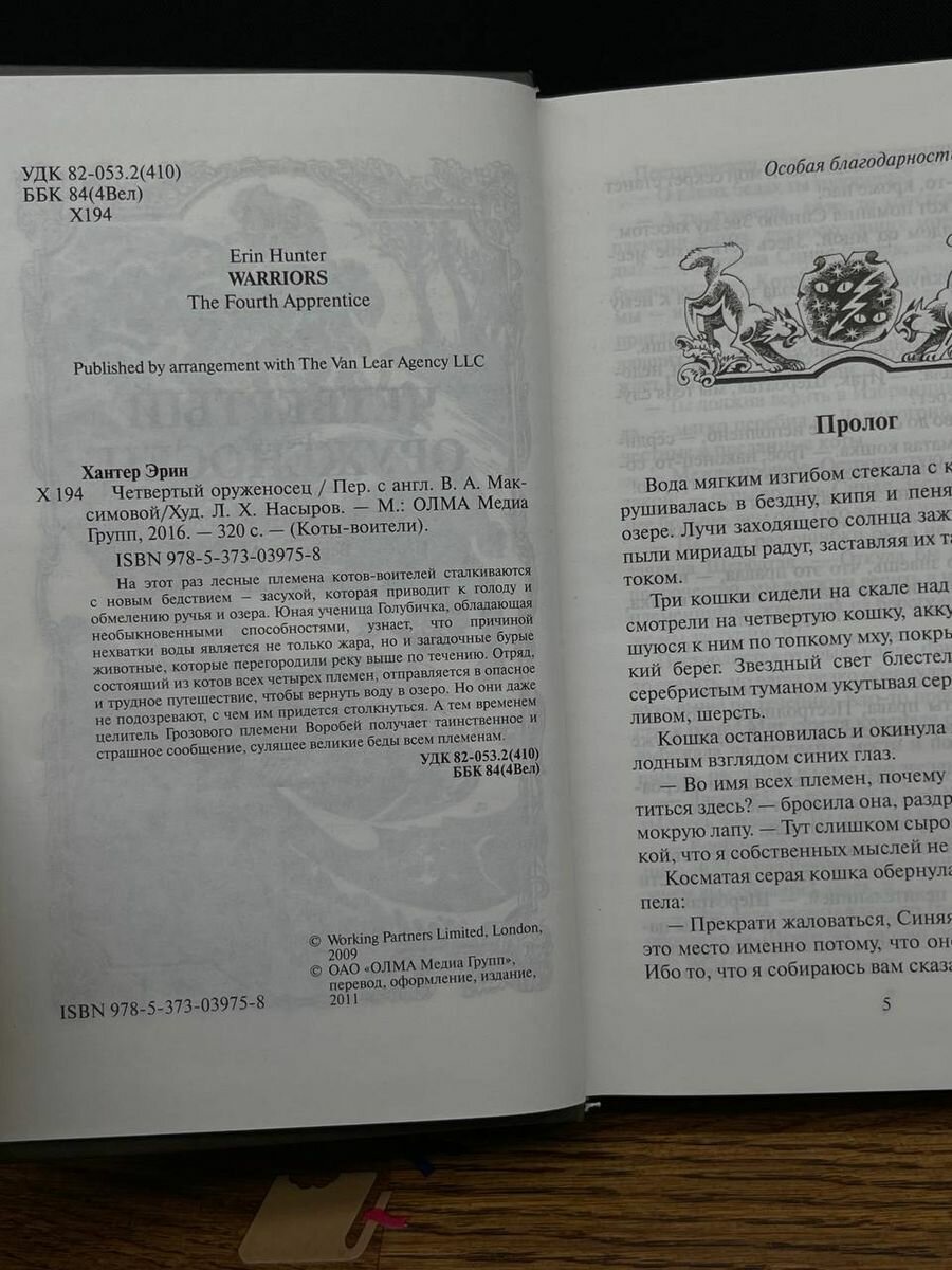 Четвертый Оруженосец - невероятно эмоциональная книга. Подробное описание, великолепные иллюстрации - из самых мельчайших деталей восстанавливается картинка нового цикла, новой жизни, нового сюжета... Утверждение, что эта книга - детская, ошибочно. В ней есть все: от скорби разлуки до горечи смерти, от познаний крепкой дружбы до верной любви. Люди, читающие котов-воителей дружны. Общий признак тех, кому нравится эта история - замечательные сюжеты и идеальная картина. Нужно отдать должное...