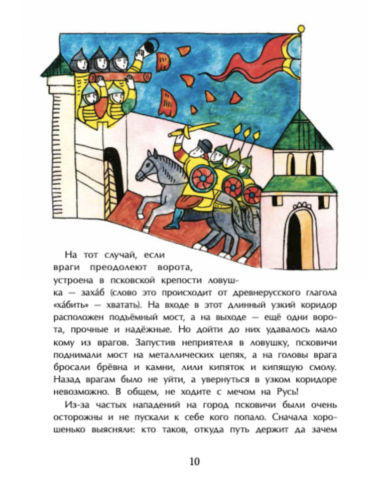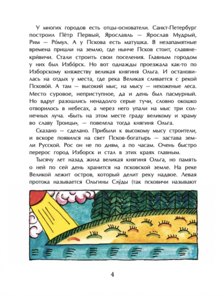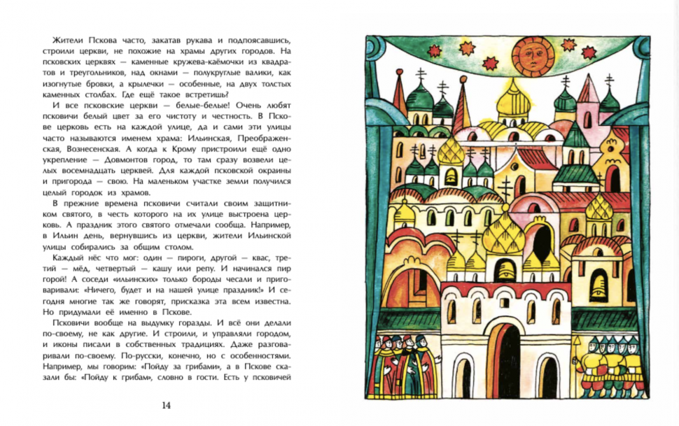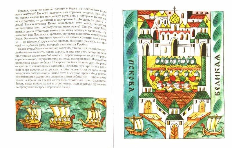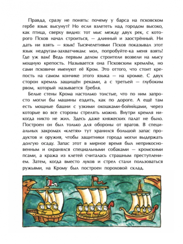 Содержание книги очень хорошее. Написано живо, с большим количеством увлекательных примеров. Цитирую: "Псковичи вообще на выдумку горазды. И всё они делали по-своему, не как другие. И строили, и управляли городом, и иконы писали в собственных традициях. Даже разговаривали по-своему. По-русски, конечно, но с особенностями. Например, мы говорим: "Пойду за грибами", а в Пскове бы сказали: "Пойду к грибам", словно в гости". Очаровательно! Автор любит свой город и пишет о нем не шаблонно, "для галочки", а от всей души. Даже мне, неплохо знающей этот город и не раз в нем бывавшей, было интересно, а 5-летний ребенок вообще слушал с горящими глазами.
