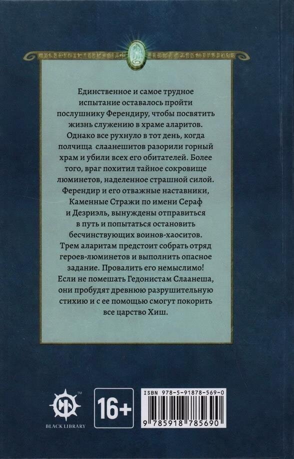 Единственное и самое трудное испытание оставалось пройти послушнику Ферендиру, чтобы посвятить жизнь служению в храме аларитов. Однако все рухнуло в тот день, когда полчища слаанешитов разорили горный храм и убили всех его обитателей. Более того, враг похитил тайное сокровище люминетов, наделенное страшной силой. Ферендир и его отважные наставники, Каменные Стражи по имени Сераф и Дезриэль, вынуждены отправиться в путь и попытаться остановить бесчинствующих воинов-хаоситов. Трем аларитам предстоит собрать отряд героев-люминетов и выполнить опасное задание. Провалить его немыслимо! Если не помешать Гедонистам Слаанеша, они пробудят древнюю разрушительную стихию и с ее помощью смогут покорить все царство Хиш.