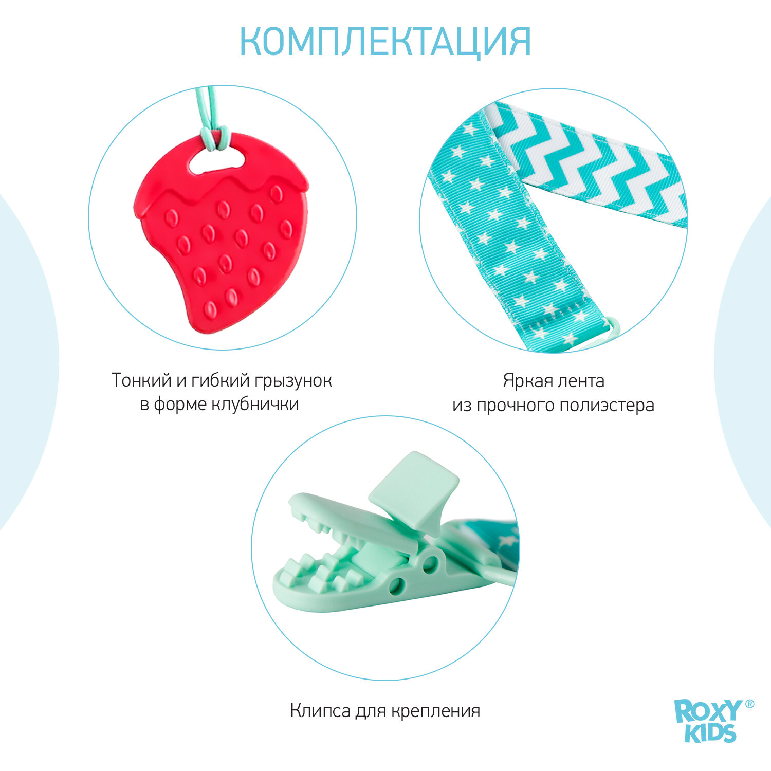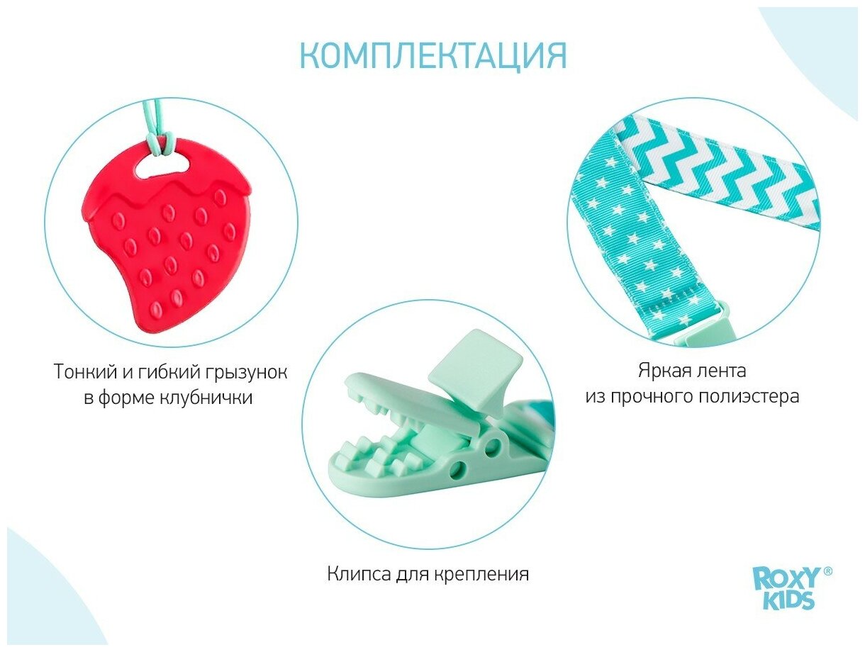 Процесс прорезывания зубов у малыша часто сопровождается неприятными ощущениями, зудом и болью. Все это портит настроение как вашему карапузу, так и вам. Помочь в такой ситуации может подбор правильного грызунка.Прорезыватель на держателе ROXY-KIDS в форме клубнички идеально подойдет маленьким непоседам! Если ваш малыш все время роняет грызунок, с новинкой от ROXY-KIDS это больше не будет проблемой. Наш прорезыватель надежно крепится к одежде ребенка при помощи яркого держателя.Мягкая клубничка имеет рельефную поверхность, которая хорошо массирует десны малыша. Кроме того, грызунок можно охладить – это поможет усилить обезболивающий эффект. Материалы, из которых сделаны прорезыватель и держатель, абсолютно безопасны и не содержат бисфенол А.Клубнички представлены в двух цветах: прозрачном и красном. А ленты найдутся на любой вкус – красного и мятного цвета, розово-голубые в полоску или в горошек. Они выполнены из прочного полиэстера и прослужат вам очень долго. Более того, держатель легко отсоединить от прорезывателя, поэтому вы сможете использовать его также с ниблером или пустышкой. Таким образом, наша новинка превращается в многофункциональный предмет для повседневной жизни малыша!
