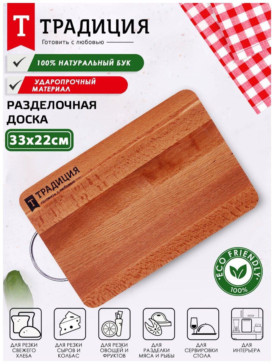 Деревянная разделочная доска выполнена из натурального бука, выращенного в России. Это древесина твердых пород, менее чувствительная к влаге. Изготовлена без красящих веществ, на поверхность нанесена водоотталкивающая пропитка растительным маслом, что защищает от впитывания соков и запахов и предотвращает размножение бактерий. Натуральная деревянная доска может быть использована для нарезки, для разделки мяса, как кухонная доска, как подставка. Можно использовать в качестве предмета сервировки для овощей, сыра, мяса, хлеба и других блюд. Деревянный аксессуар - это экологичный и недорогой подарок. Красивая, а главное прочная и износостойкая, такая доска станет украшением любой кухни! Для продления срока службы рекомендуем после каждого использования протирать влажной губкой, вытирать насухо и каждый месяц обрабатывать растительным маслом. Не мойте в посудомоечной машине. Соблюдайте рекомендации, и доска прослужит вам долго! Размер 33х22 см, толщина 1,6 см.