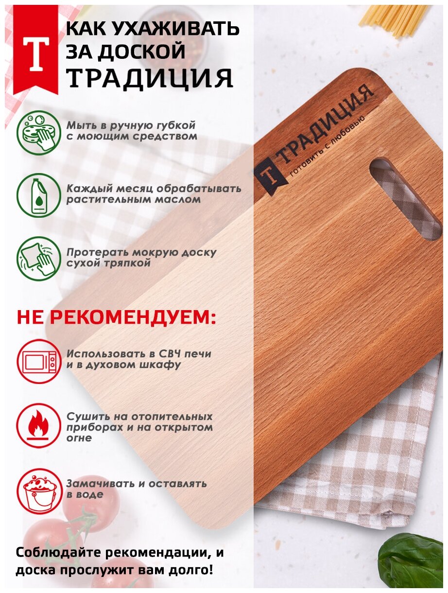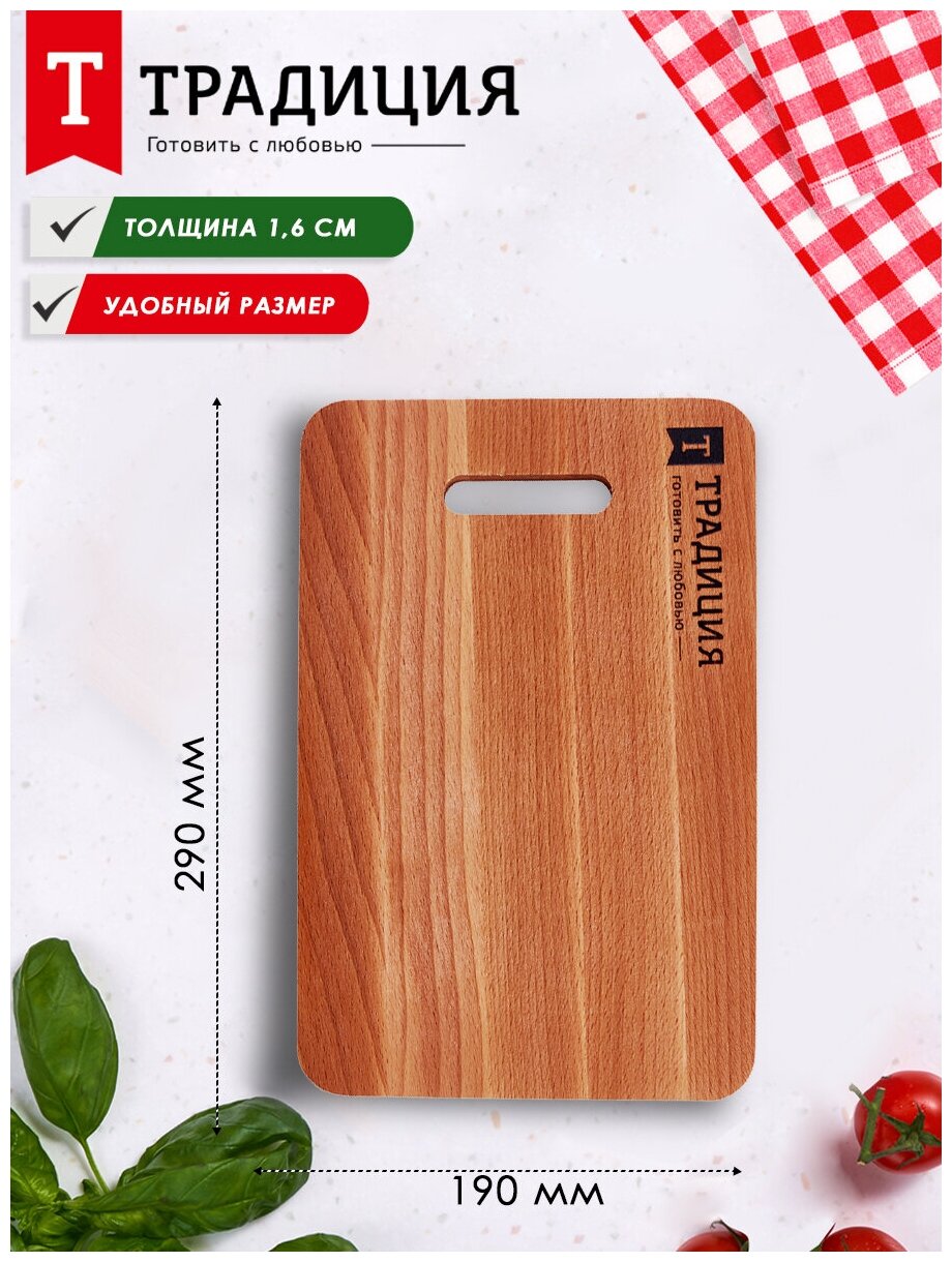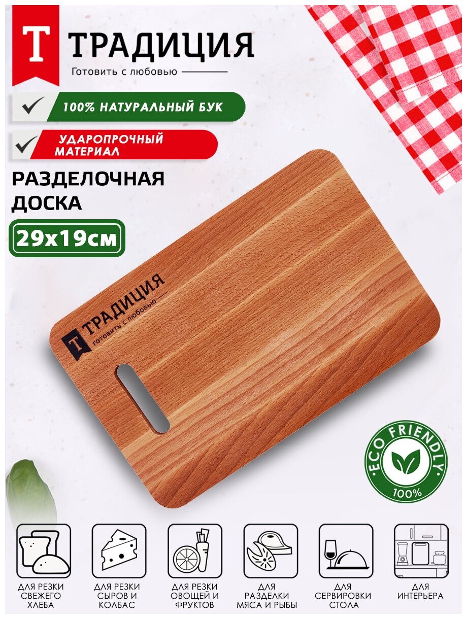 Деревянная разделочная доска выполнена из натурального бука, выращенного в России. Это древесина твердых пород, менее чувствительная к влаге. Изготовлена без красящих веществ, на поверхность нанесена водоотталкивающая пропитка растительным маслом, что защищает от впитывания соков и запахов и предотвращает размножение бактерий. Натуральная деревянная доска может быть использована для нарезки, для разделки мяса, как кухонная доска, как подставка. Можно использовать в качестве предмета сервировки для овощей, сыра, мяса, хлеба и других блюд. Деревянный аксессуар - это экологичный и недорогой подарок. Красивая, а главное прочная и износостойкая, такая доска станет украшением любой кухни! Для продления срока службы рекомендуем после каждого использования протирать влажной губкой, вытирать насухо и каждый месяц обрабатывать растительным маслом. Не мойте в посудомоечной машине. Соблюдайте рекомендации, и доска прослужит вам долго! Размер 29х19 см, толщина 1,6 см.
