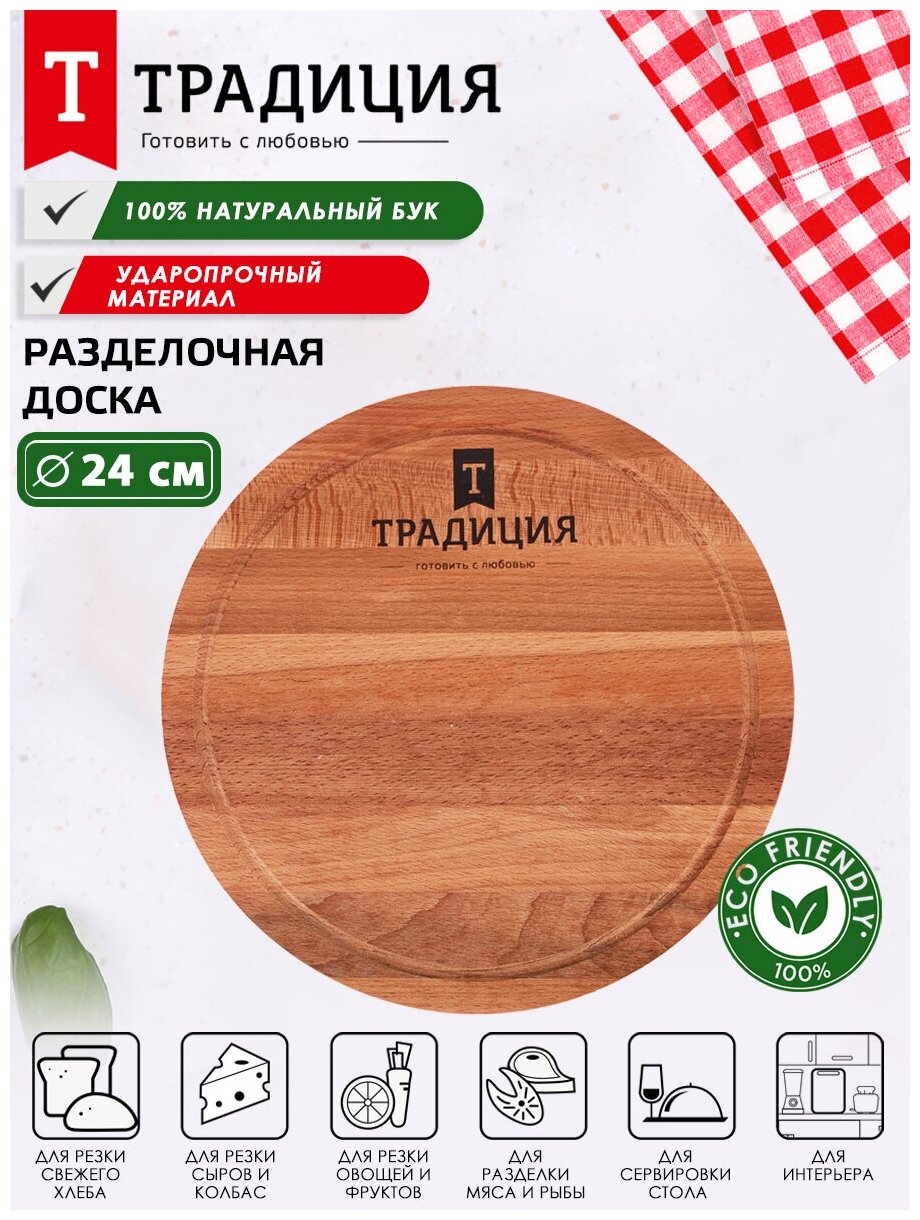 Деревянная разделочная доска выполнена из натурального бука, выращенного в России. Это древесина твердых пород, менее чувствительная к влаге. Изготовлена без красящих веществ, на поверхность нанесена водоотталкивающая пропитка растительным маслом, что защищает от впитывания соков и запахов и предотвращает размножение бактерий. Натуральная деревянная доска может быть использована для нарезки, для разделки мяса, как кухонная доска, как подставка. Можно использовать в качестве предмета сервировки для овощей, сыра, мяса, хлеба и других блюд. Доска имеет углубление для стока жидкости вдоль края. Красивая, а главное прочная и износостойкая, такая доска станет украшением любой кухни! Деревянный аксессуар - это экологичный и недорогой подарок. Для продления срока службы рекомендуем после каждого использования протирать влажной губкой, вытирать насухо и каждый месяц обрабатывать растительным маслом. Соблюдайте рекомендации, и доска прослужит вам долго! Размер 24 см, толщина 1,6 см.