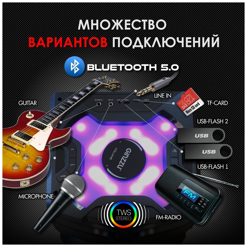 Мощная переносная акустическая система Ginzzu GM-203. Сочный и четкий бас, чистый пространственный звук. Идеальная многофункциональная музыкальная система для дома и для улицы. Пульт, дисплей, эквалайзер, регулировка низких и высоких частот, система Мега бас и много других возможностей, чтобы услышать любимую музыку. Может работать как от сети, так и от встроенной аккумуляторной батареи. Динамическая подсветка динамиков 3 вида подсветки.