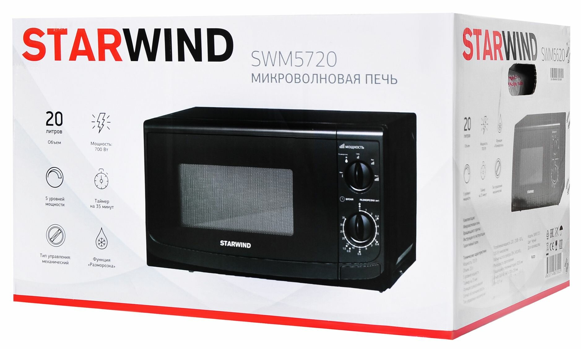 Микроволновая печь STARWIND SWM5720 – простая и доступная во всех отношениях модель с минимальным набором функций. Будет полезна в офисе, на даче и дома. Работает на размораживание, разогрев и приготовление простейших блюд: горячих бутербродов, сэндвичей. Управление осуществляется с помощью механических поворотных переключателей, которые расположены на передней панели. Все положения интуитивно понятны, имеют условные обозначения. Корпус микроволновки Starwind выполнен в черном цвете, имеет достаточно привлекательный внешний вид. Отлично будет смотреться на любой кухне. Благодаря глянцевой поверхности внутри и снаружи, не создает сложностей в уходе. Дверца открывается мягко и бесшумно, с помощью кнопки. Несмотря на простоту, СВЧ прекрасно функционирует во всех режимах. Максимальная мощность в 700 Вт обеспечивает все процессы. Пища прогревается равномерно и за короткий промежуток времени. При осуществлении размораживания можно производить регулировку по весу.