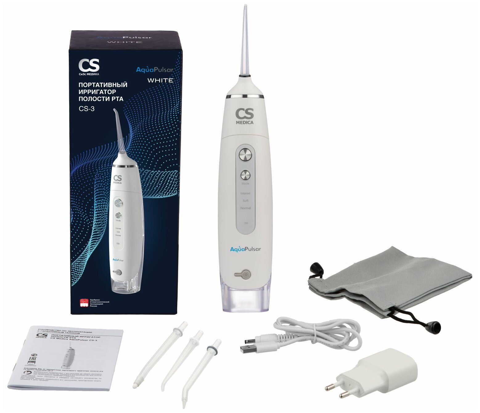 | Комплектация | электронный блок, резервуар для растворов, насадки для ирригатора (стандартные (2 шт.), ортодонтальная (1 шт.), пародонтальная (1 шт.)), зарядное устройство CH-AP3, чехол для хранения и переноски, руководство по эксплуатации с гарантийным талоном |