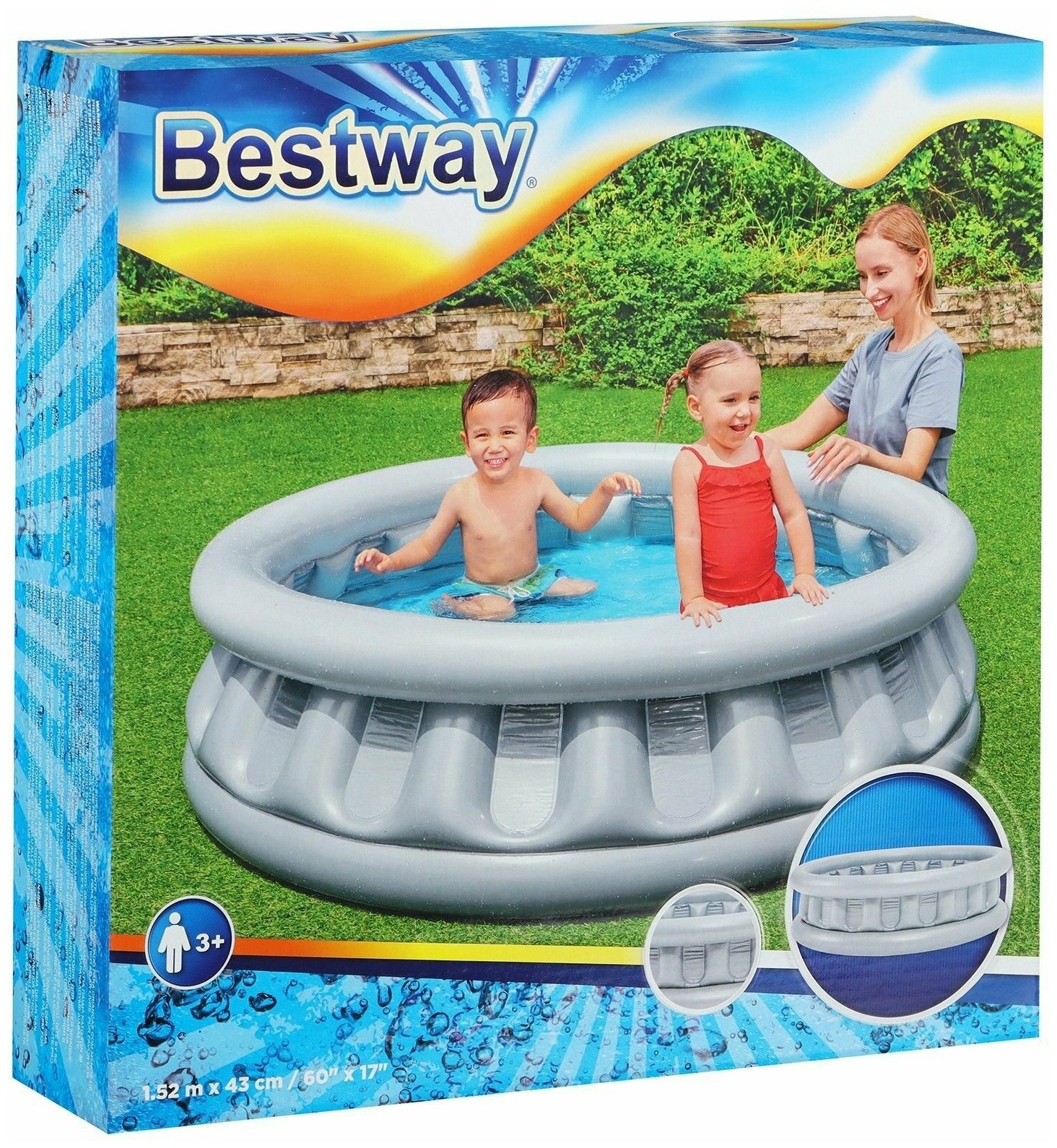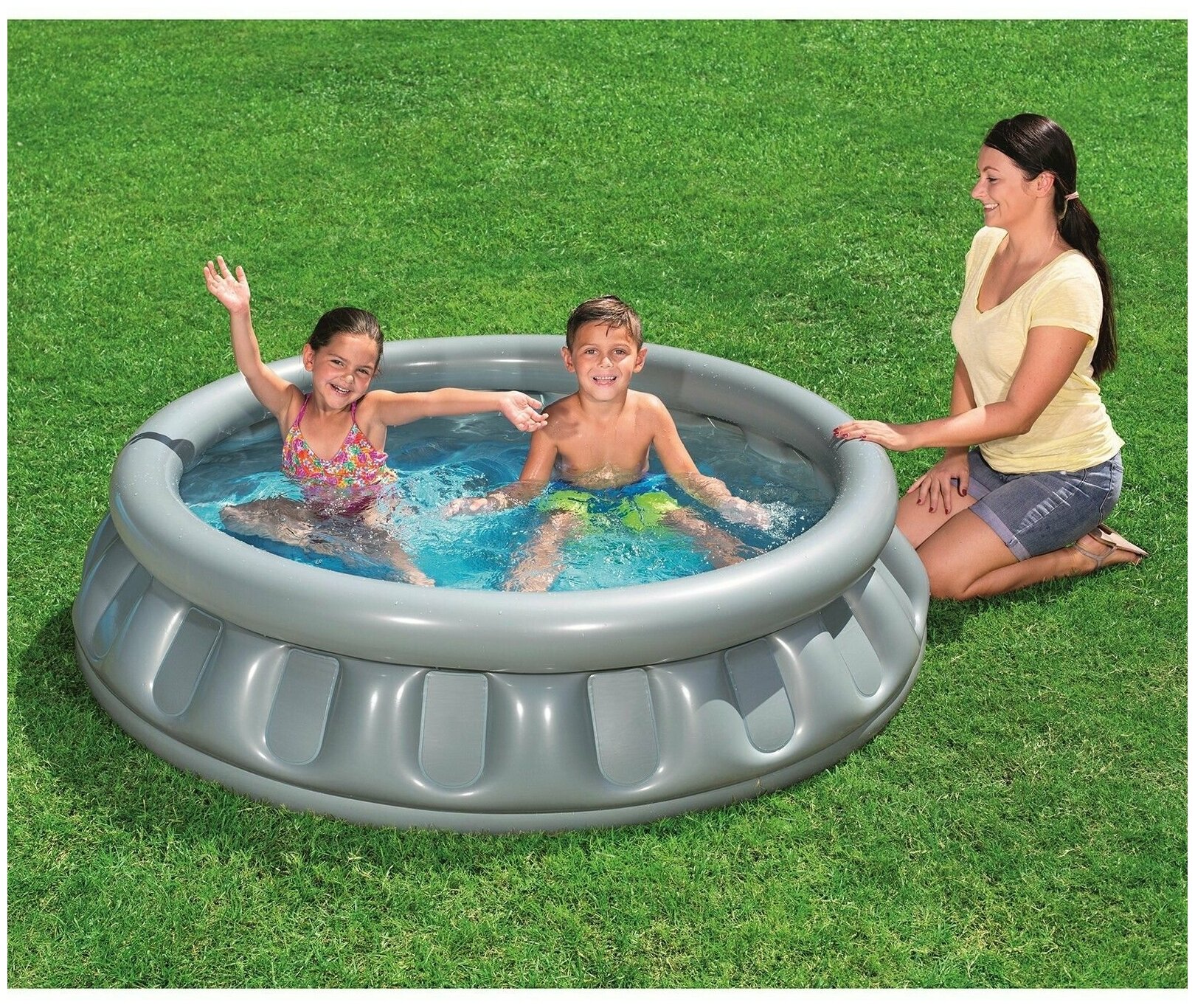 Бассейн быстро надувается и устанавливается на любой ровной поверхности.