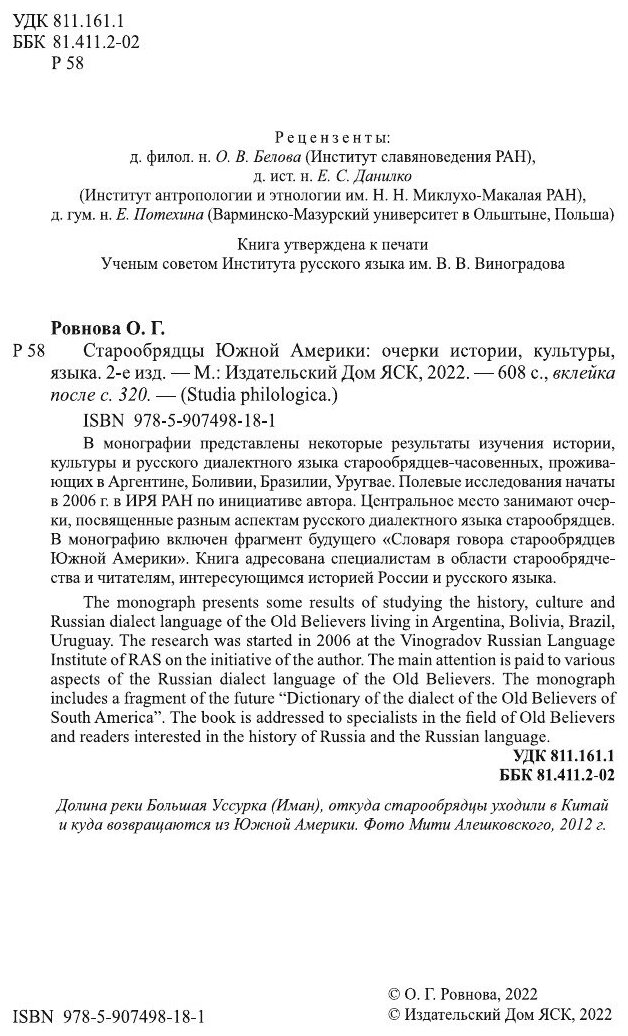 Старообрядцы Южной Америки: очерки истории культ. (О. Г. Ровнова); Языки Славянской Культуры, 2022