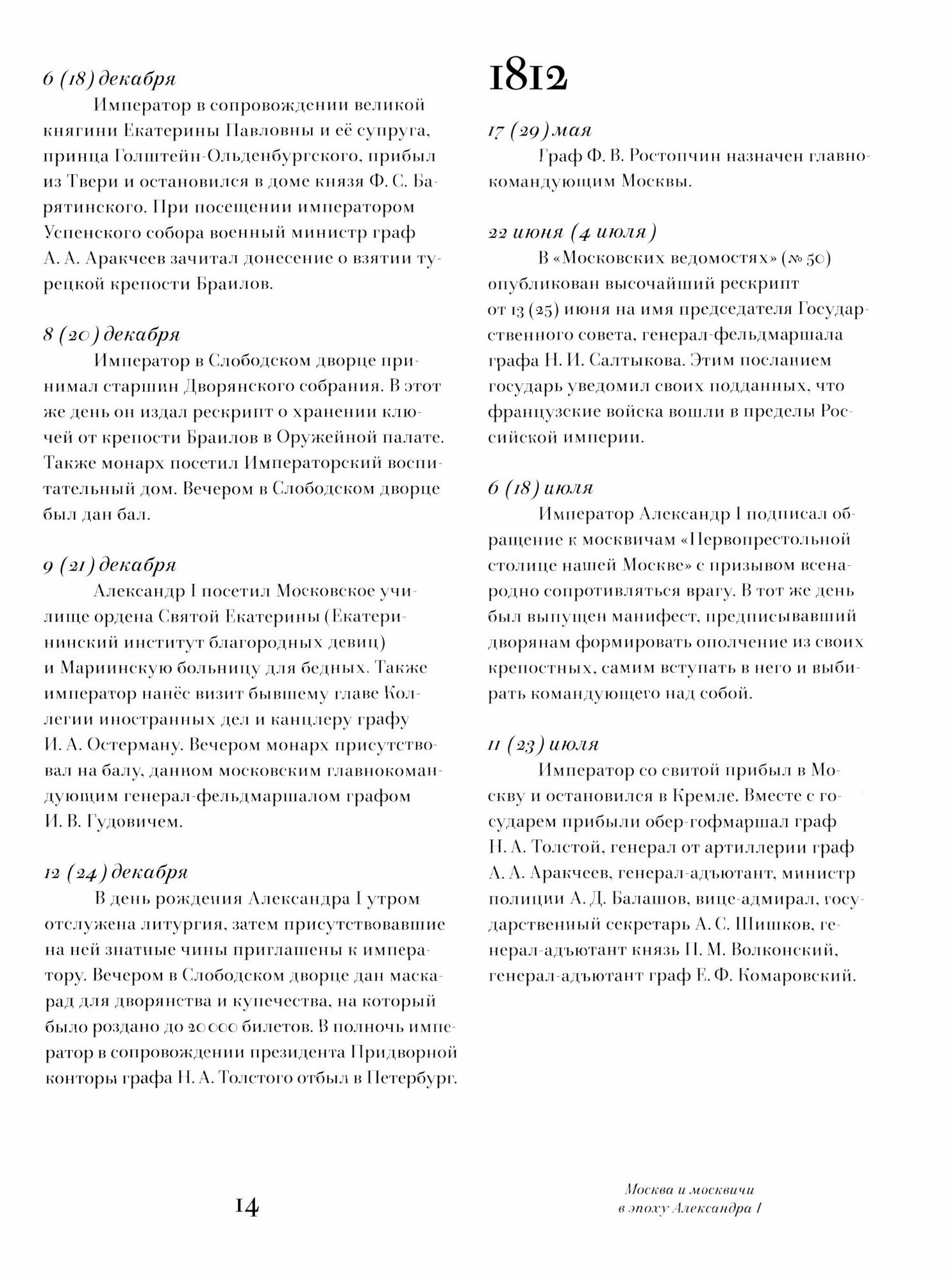 В Приуроченное к 875-летию Москвы издание "Москва и москвичи в эпоху Александра I" - масштабный проект, подготовленный авторами-историками, запечатлевающий исторический портрет Москвы в 1801-1825 годы. Помимо богатого иллюстративного ряда читатель найдет здесь описание основных событий этого периода, особенностей быта москвичей разных сословий, того, чем они жили, во что одевались, как развлекались. Затронуты и трагические страницы истории Первопрестольной: совет в Филях и печально известный пожар 1812 года. В последней главе рассказывается о восстановлении Москвы после этого пожара. Издание будет в первую очередь интересно историкам, этнографам, архитекторам, а также всем интересующимся историей нашей столицы.