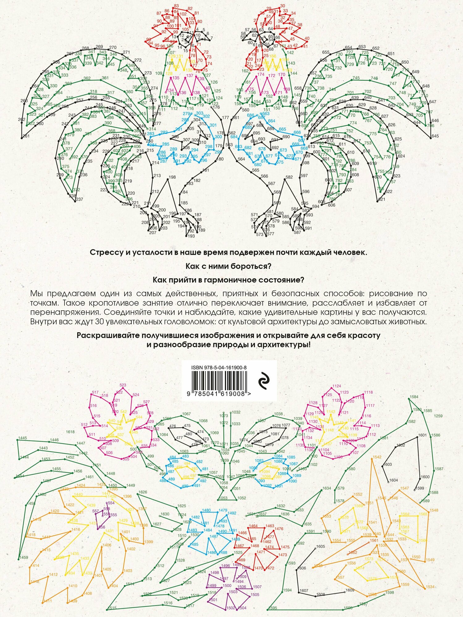 Книга формата А4 с плотными листами, которые при рисовании гелевой ручкой не просвечивают на обратной стороне. Рисунки сложные и простые, очень разнообразной тематики, но близкой к животным. Очень люблю соединять точки и подобные книги, провела немало времени за подобным успокаивающим занятием времени. Особенностью данной книги является прерывание линии и начало ее в любом месте рисунка, что порой крайне затруднительно при большом количестве точек, можно минут 10 искать следующую цифру. Но рисунки красивые, за счет большого числа точек - прорисованы хорошо и реалистично. Очень довольна этой книгой, куплю еще из этой серии