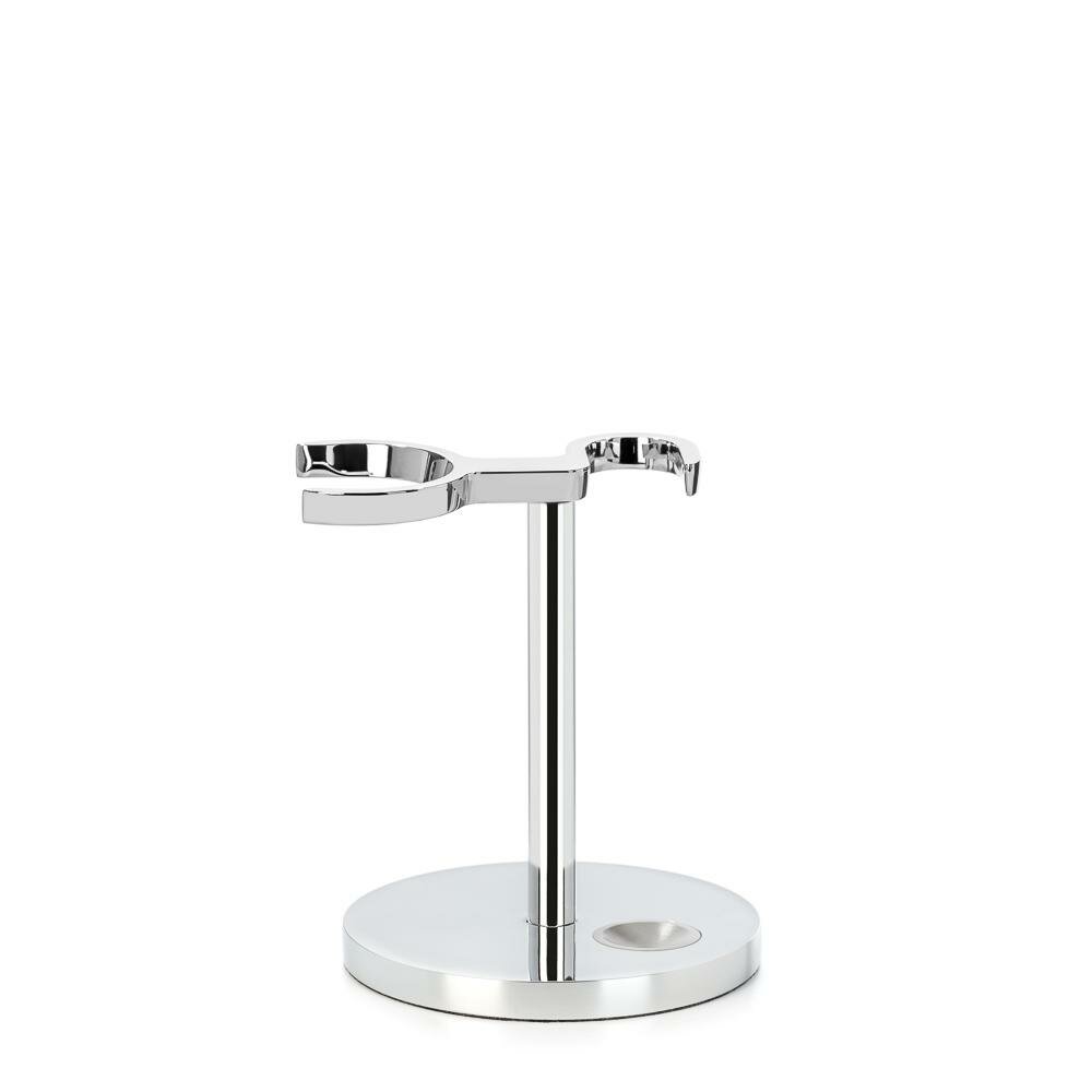 Эта классическая модель подставки из хромированного металла устойчиво стоит на поверхности. С ее помощью вы можете хранить различные комбинации аксессуаров, состоящих из бритвы и помазка.