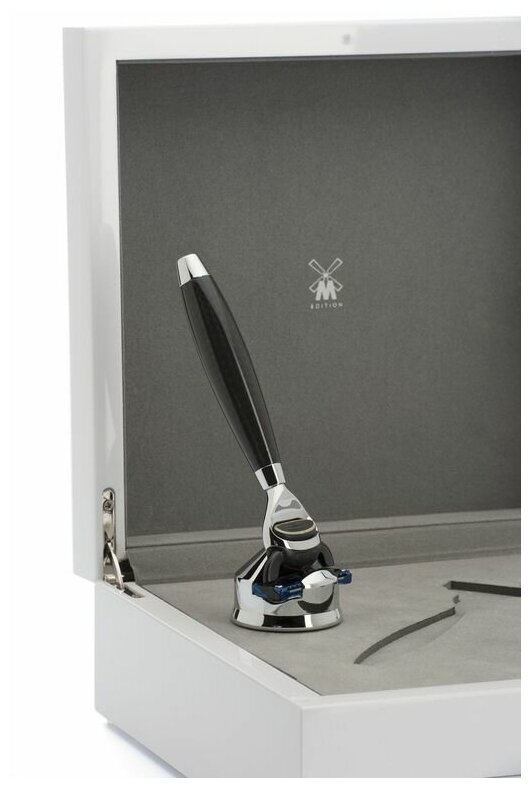 Для каждого аксессуара коллекции MUEHLE EDITION №1 волокна карбона обрабатываются вручную. Заготовку, которой предназначено стать ручкой бритвы или помазка, покрывают карбоновым сплетением, а затем помещают в форму, где волокна выравниваются, принимая нужный изгиб, пропитываются и отверждаются с помощью синтетической смолы. Затем следует несколько этапов полировки. Этот процесс позволяет создать восхитительную зеркальную мерцающую поверхность. Его изобретение стало вдохновением для создания юбилейной коллекции, посвященной 65-тилетию компании MUEHLE.