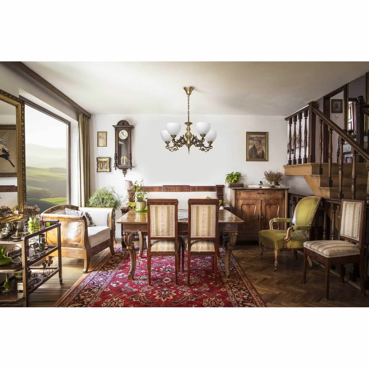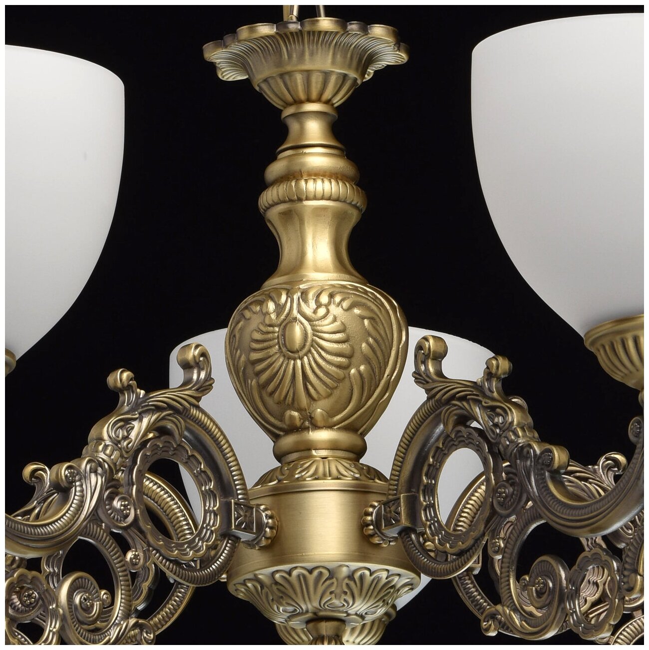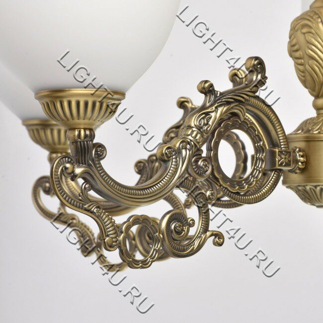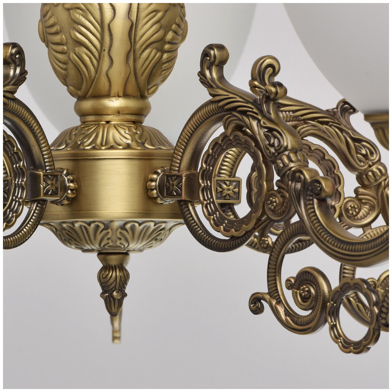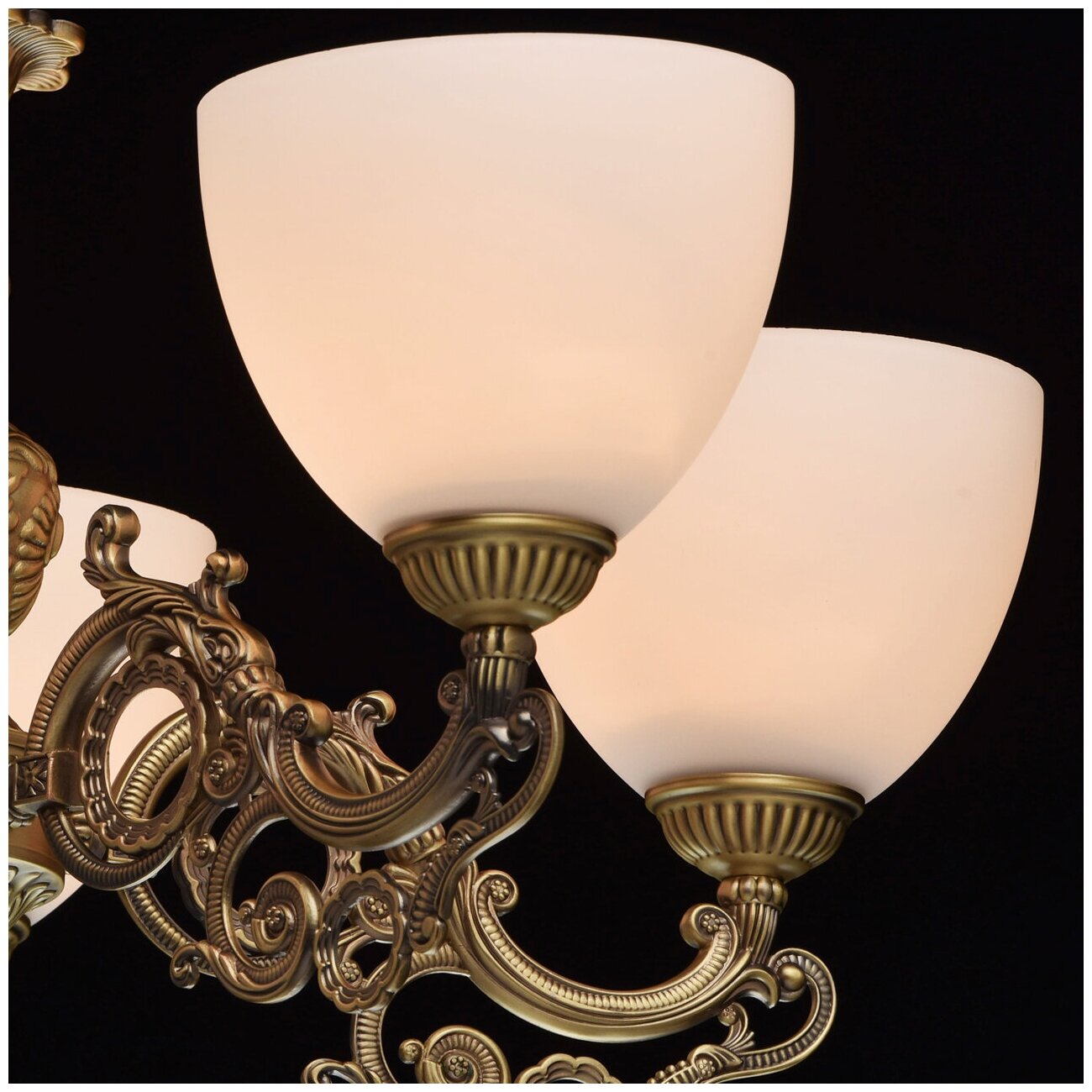 Роскошная люстра из коллекции «Ариадна» выполнена в лучших традициях классического стиля. Матовое Металлическое основание цвета античной бронзы гармонично сочетается с широкими плафонами. Выполненные из матового белого стекла, они идеально подчеркивают бронзовый оттенок. В тон основанию и декор рожков, а множество изящных завитков придают композиции особенную грациозность.