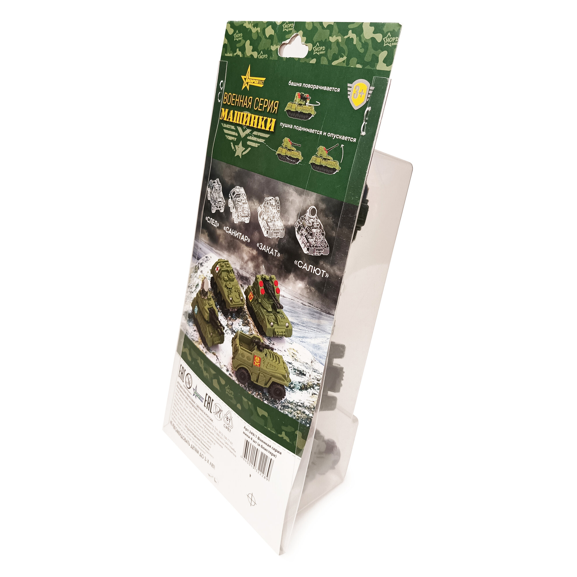 В набор входят четыре военные машинки: Зенитная установка Салют, Бронетранспортер Санитар, Боевая машина поддержки танков Закат и Разведывательная машина След. Основное отличие — это доскональная деталировка машинок, функциональность и узнаваемость, поскольку многие из них имеют реальные прототипы в российской армии.