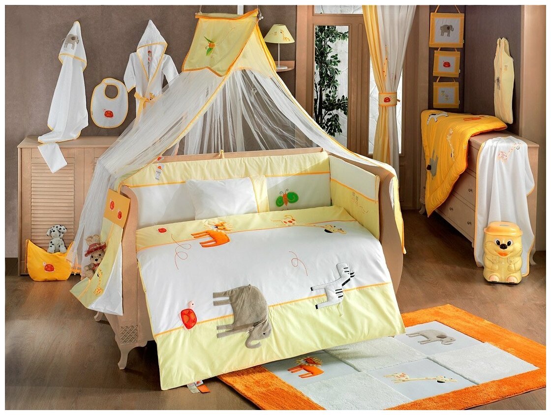 Данный комплект постельных принадлежностей не только позволит правильно организовать сон малыша, но и познакомит его с такими интересными животными, как жираф, зебра, слон и лев. Выполненные в виде красочных аппликаций, они сразу привлекут внимание ребенка.