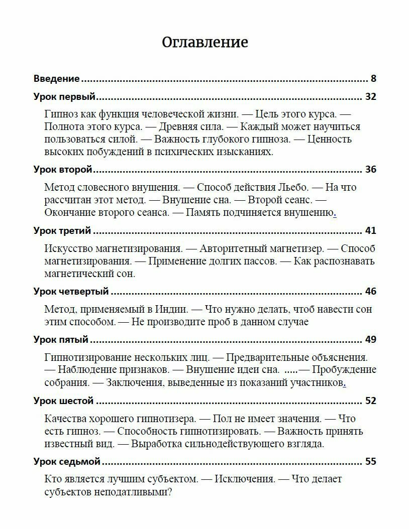 Этот курс пришел к нам с золотой эпохи расцвета практик гипноза. Это классическое руководство по техникам гипноза. Своеобразный базовый исходник техник, на котором учились целые поколения практикующих гипноз. Благодаря этой книге вы узнаете и получите практические рекомендации по тому, как вводить в гипноз, проводить словесное внушение, вводить в состояние сна, управлять памятью клиента, проводить групповые сеансы гипноза, внушать галлюцинации, проводить сеансы лечебного гипноза, сеансы гипноза с детьми, лечить заикание, ревматизм, убирать головную боль, успокаивать нервы, обезболивать, устранять алкогольную и наркотическую зависимости, применять гипноз во врачебной практике, в зубоврачебном деле, наводить гипноз на расстоянии, использовать гипноз для передачи и внушения мыслей, а также узнаете про сценический и мгновенный гипноз, в дополнение получите техники развития ясновидения и лечения магнетизмом. Эта книга - классика, которую обязан знать каждый, кто практикует гипноз или просто им интересуется.