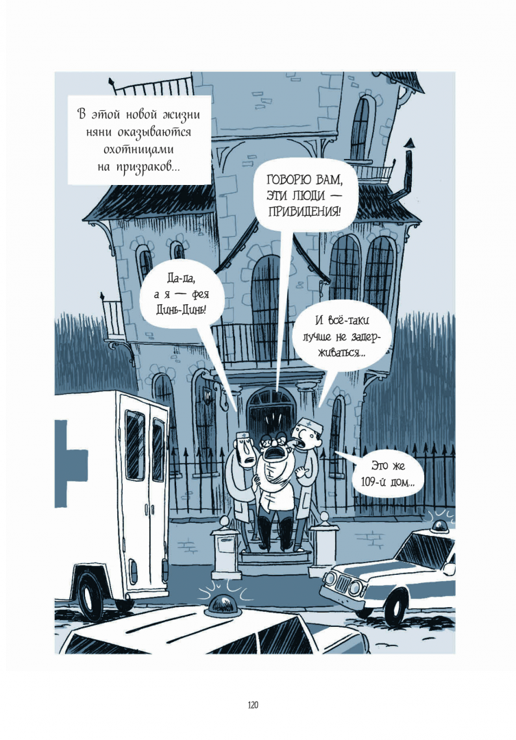 Это отличный комикс для детей,с довольно таки интересным сюжетом.Мальчик со своей семьёй перебирается в городок, где они заселяются в дом, на окраине (домик как на обложке)и собственно в этом домике оказывается много призраков. Родители мальчика в постоянных командировках и ему не хватает внимание,которое дают ему эти привидения,но однажды в дом приезжает охотника на приведений под видом няни.Кдассный комикс который можно прочитать с ребёнком за вечер