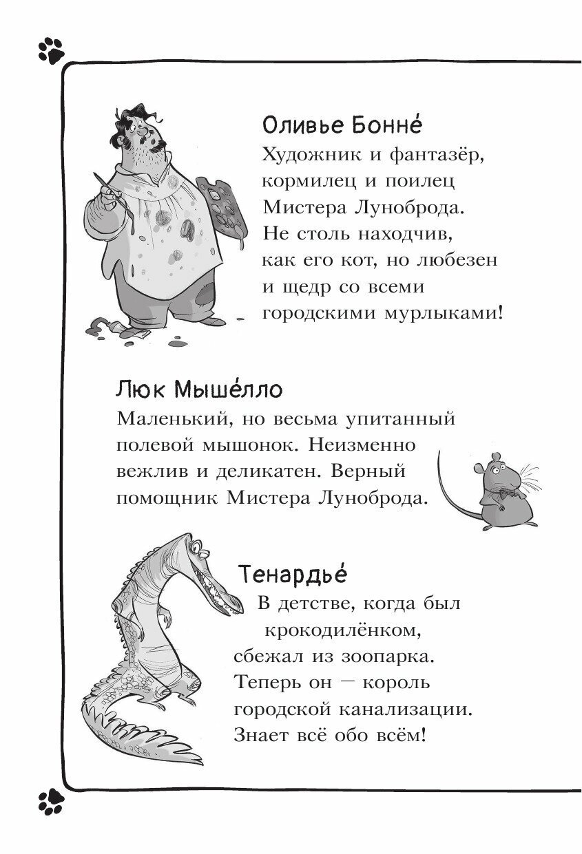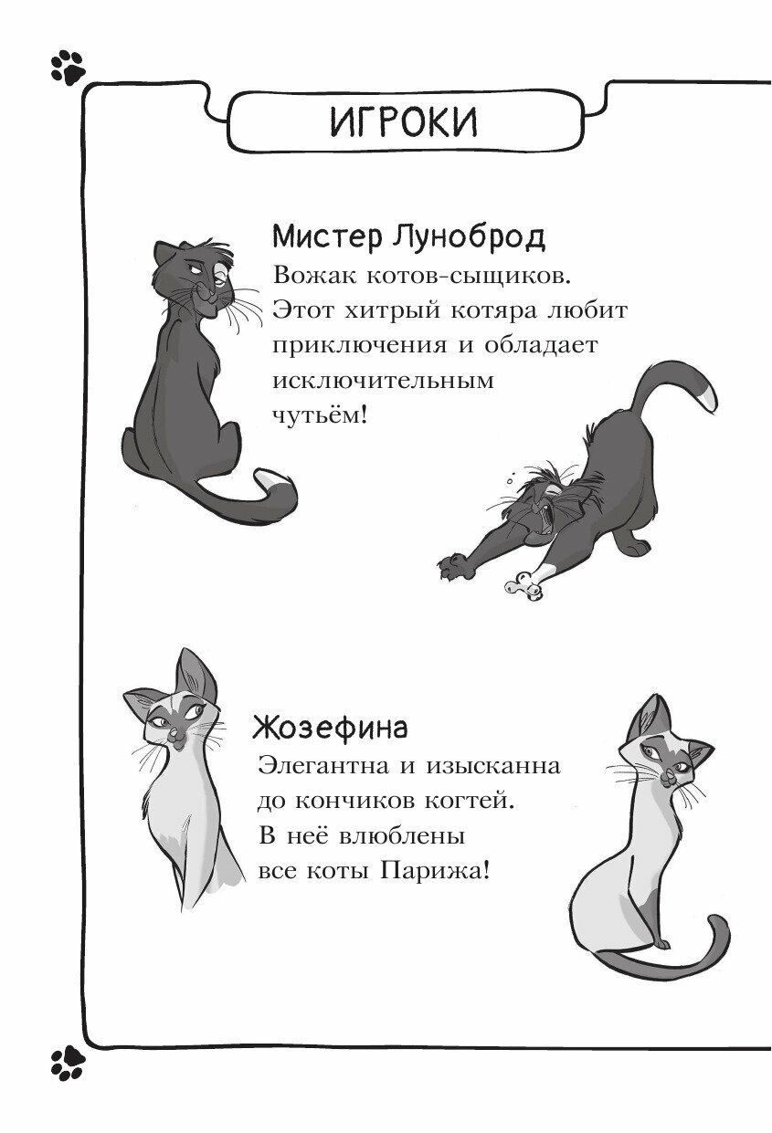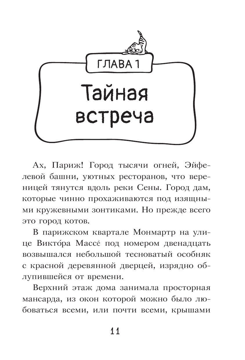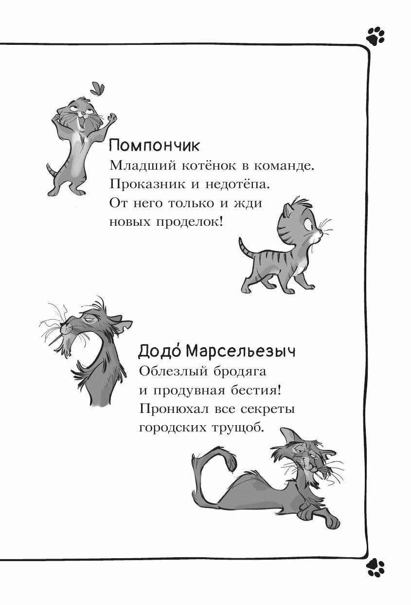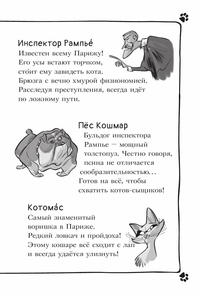 В Париже похищен знаменитый повар Пьер Паштет, украдены драгоценные серьги знаменитой актрисы Мари Белиссимы, а в доме вдовы де Бульон пропала бесценная статуэтка… Пока инспектор Рампье и его толстопузый помощник пёс Кошмар бродят по ложному следу. Коты-детективы проявляют удивительную смекалку. Безошибочное чутьё и кошачья хитрость - вот гарантия успеха!