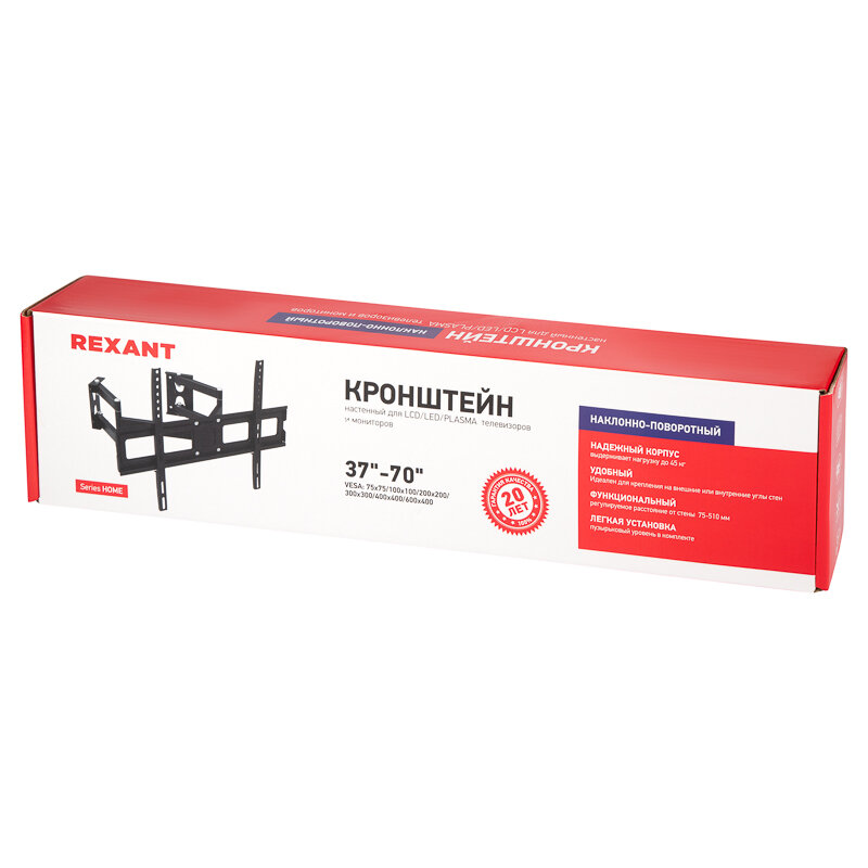 Универсальный наклонно-поворотный кронштейн Rexant позволит прочно зафиксировать на стене телевизор или монитор любой марки с диагональю от 37 до 70 дюймов. Конструкция из холоднокатаной стали выдерживает нагрузки до 45 кг. Благодаря используемому типу крепления с двумя двойными коленями, регулировка положения телевизора производится без особых усилий: всего одним движением руки можно подобрать оптимальное положение экрана, чтобы с комфортом насладиться просмотром любимой передачи. Телевизор может быть зафиксирован в наклоне от -10 до +12 градусов. Расстояние от стены можно менять в широком диапазоне от 75 до 510 мм. Конструкцию можно размещать как на внешний, так и внутренний угол стены. Кронштейн поддерживает крепления стандарта VESA: 75х75, 100х100, 200x200, 300x300, 400x400 и 600х400.