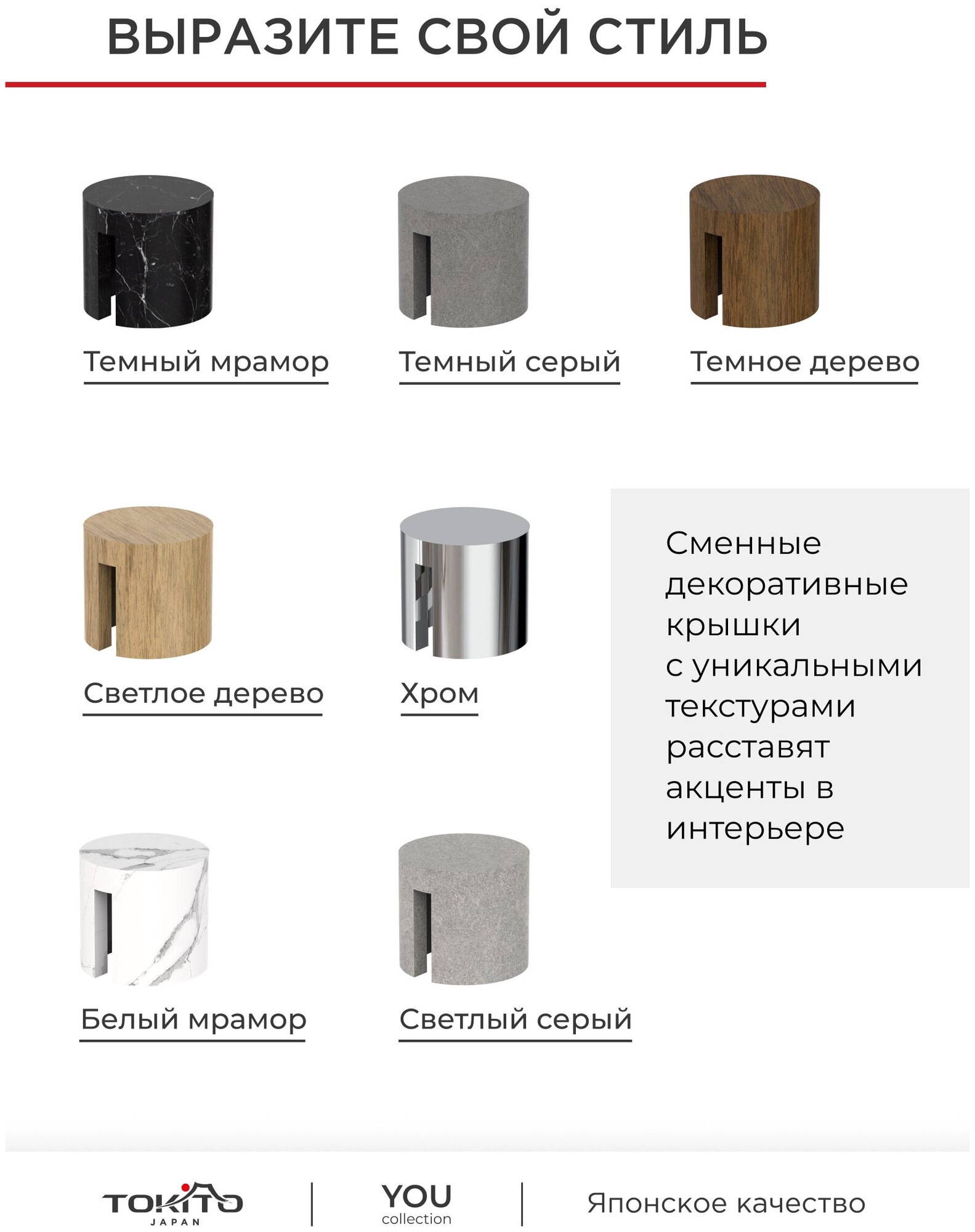 Новое прочтение формы смесителя создается не только благодаря уникальному дизайну, но и декоративным сменным крышечкам. Семь различных текстур на магнитном креплении расставляют акценты в интерьере - выразите свой собственный стиль!