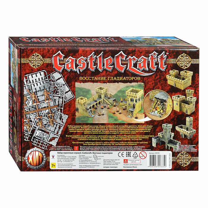 Комплектация | отливка (базовая), отливка (руины-обвал), отливка (башня выступающая), отливка (арка 1), римляне и гладиаторы, 1 кубик д6, специальные правила Castle Craft – тактика, линейка из БФ, инструкция по раскраске, инструкция по сборке замка, упаковка |