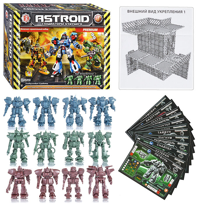 | Состав набора | 12 пластиковых миниатюр роботов, Строительный конструктор для сборки укреплений (более 60 деталей), Правила игры, Армлисты роботов, книга рассказов "Гладиаторы будущево", кубик и игровые принадлежности |