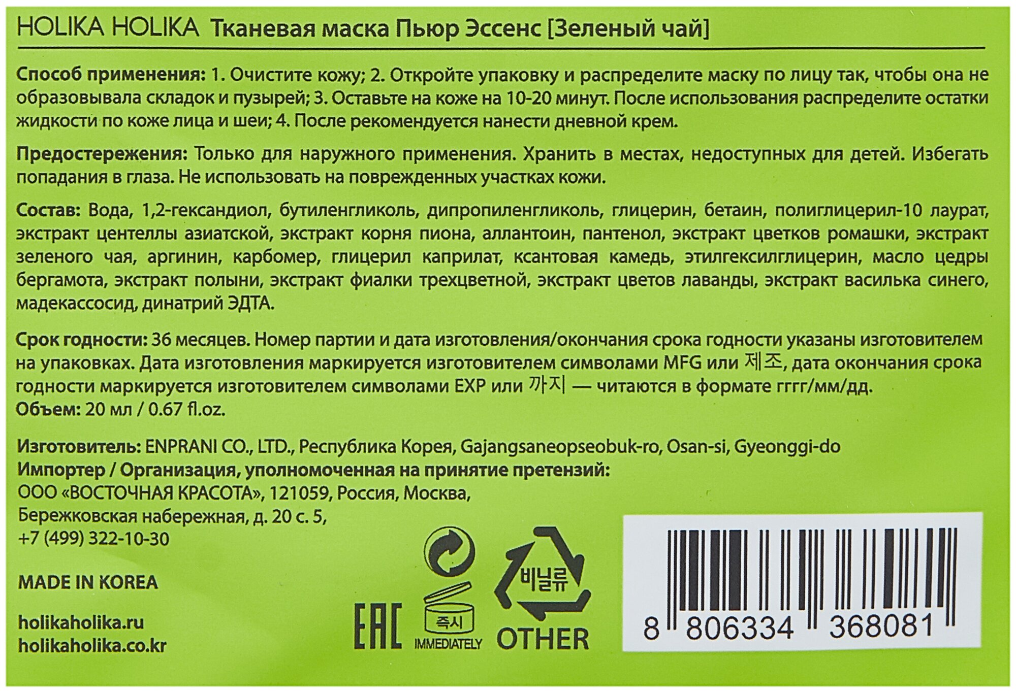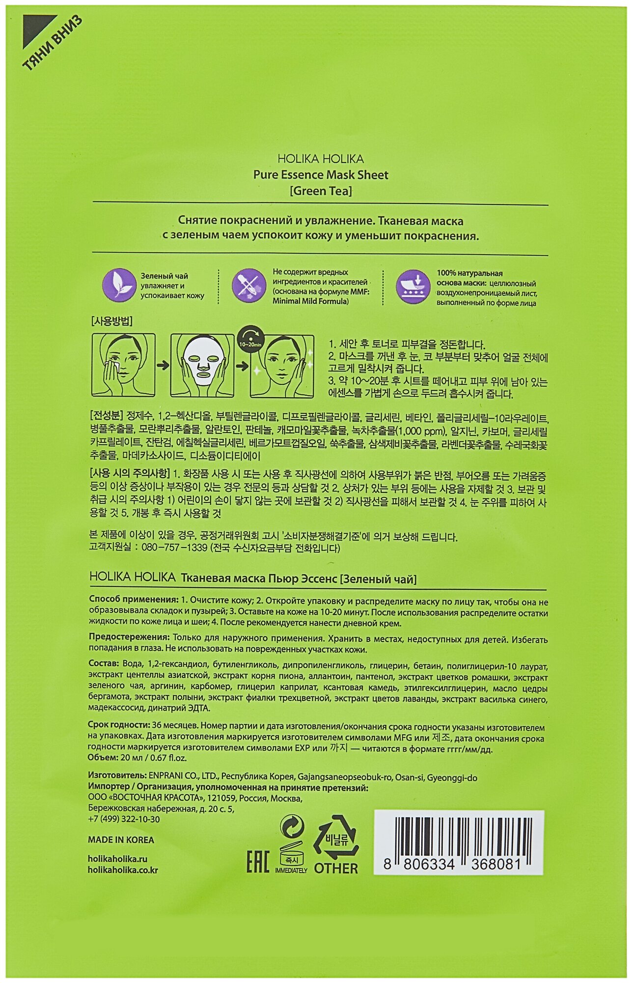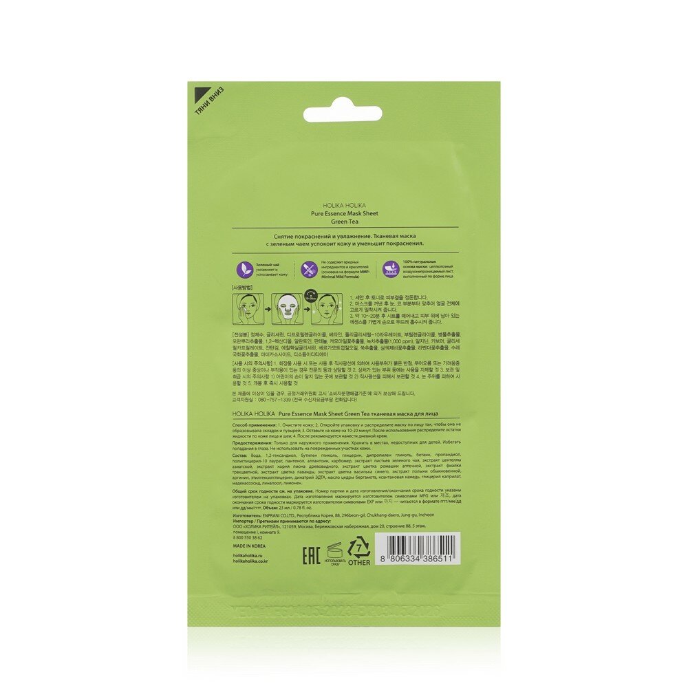 Модель: тканевая Противовоспалительная Pure Essence зеленый чай