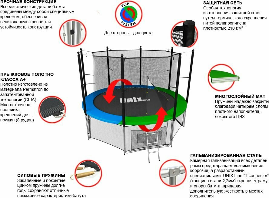 - Для максимальной защиты пользователей, UNIX line оснащен нижней и верхней сетками (с удобной и надежной застежкой), а также боковыми матами по всему периметру и специальной лесенкой.