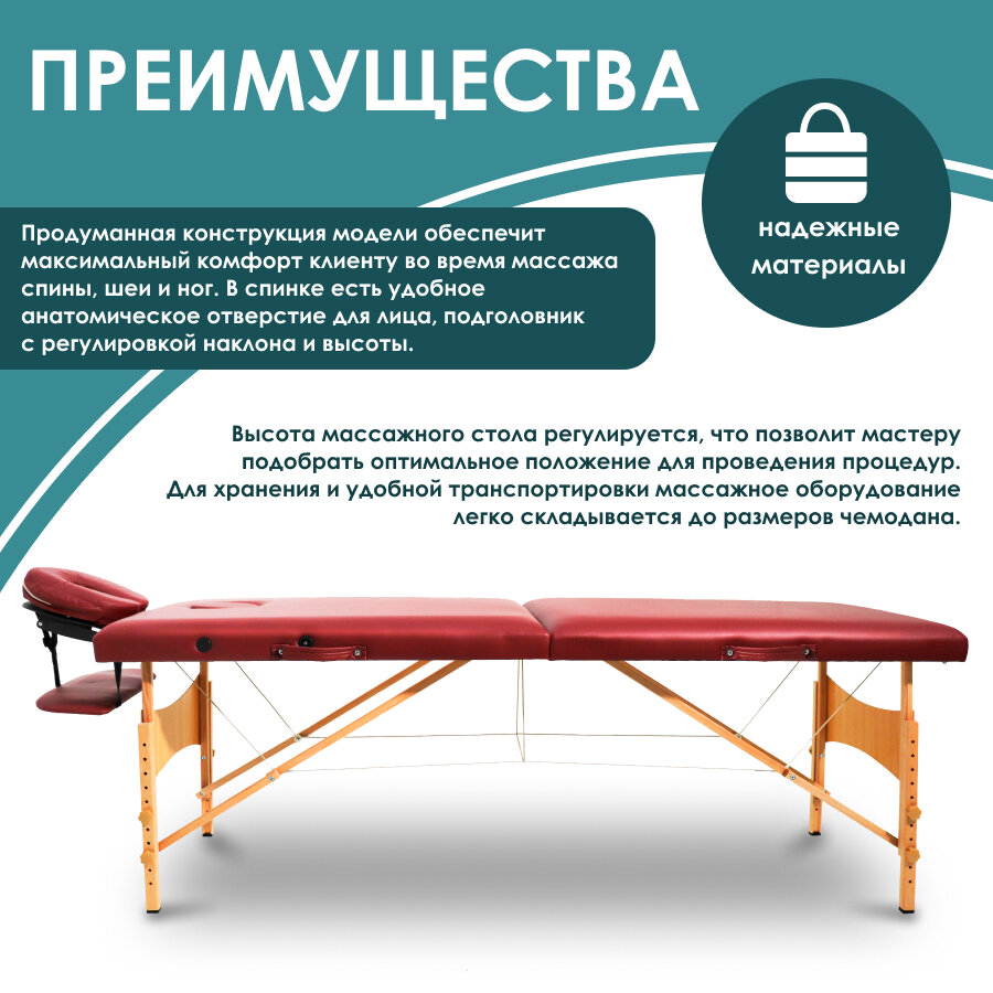 Каркас из высококачественного дерева прочен и долговечен, выдерживая интенсивное использование с течением времени. Влагостойкая обивка из кожзама устойчива к износу, легко чистится и дезинфицируется, гарантируя безупречный внешний вид даже после многочисленных процедур.