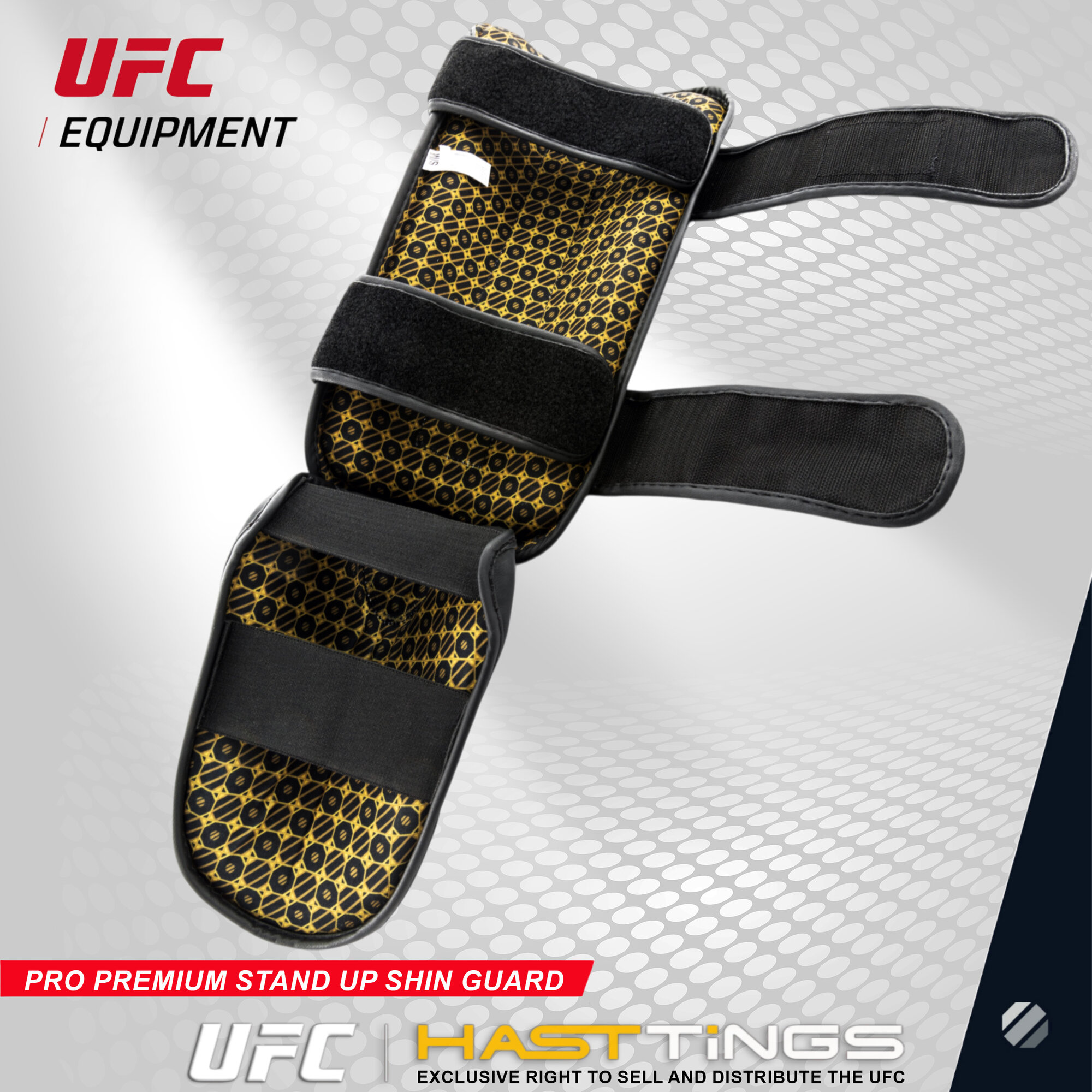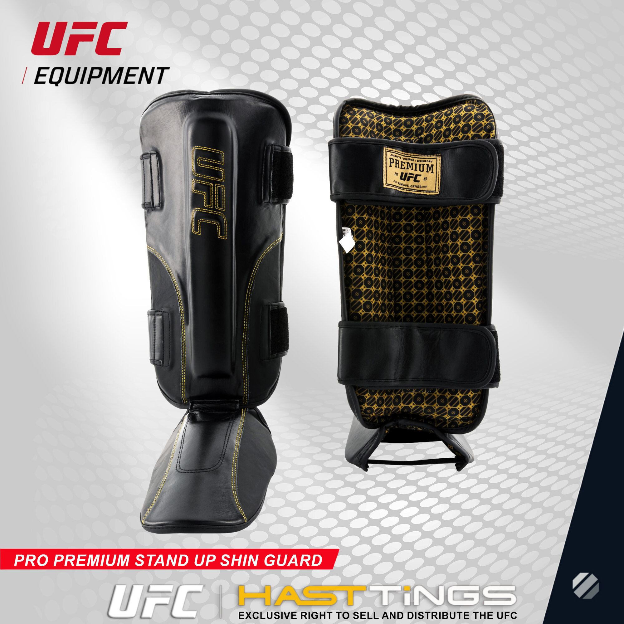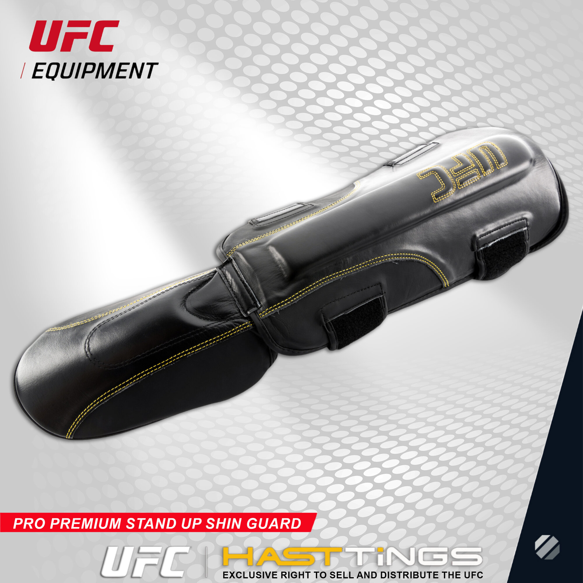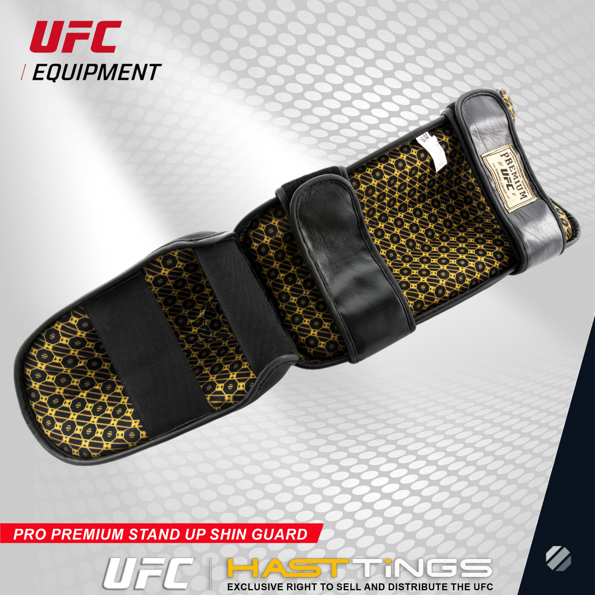 Защита голени на липучках UFC изготовлена из натуральной воловьей кожи класса А. Модель имеет слой контурированной эргономичной пены Eva толщиной более 3,75 см. Особенностями изделия является система застежки из твердой кожи и нескользящая при намокании подкладка.