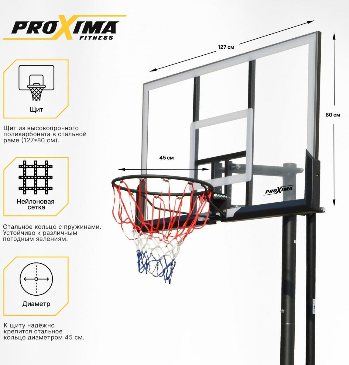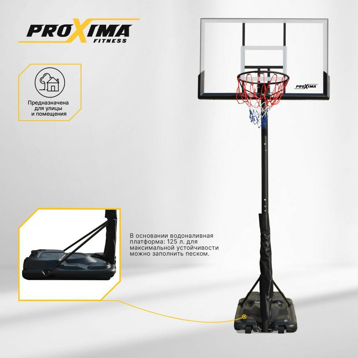 Баскетбольная мобильная стойка Proxima 44", подходит для оборудования уличных спортивных площадок и для закрытых спортивных залов. Материалы, применяемые для изготовления стойки, устойчивы к различным атмосферным явлениям и обладают повышенной износоустойчивостью.