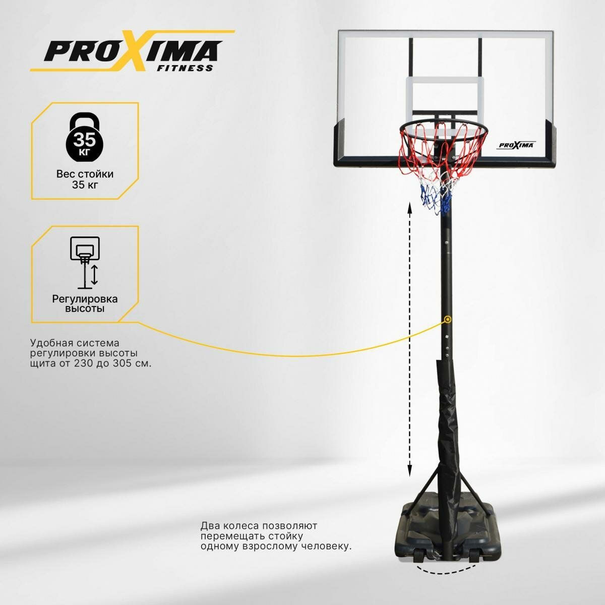- Удобная система регулировки высоты щита (от 230 до 305 см)