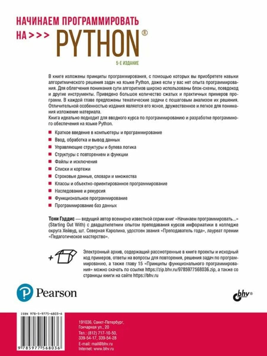 Начинаем программировать на Python 5-е издание (Тони Гэддис); БХВ-Петербург, 2022