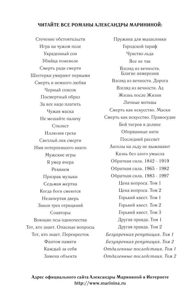 Как я уже где-то писала, детективы Марининой, а особенно о Каменской очень любит моя подруга и всегда спешит поделиться впечатлениями. Ей нравится, что параллельно с расследованием преступления показываются судьбы людей, характеры как тех, кто связан с трагедией, так и полицейских. Это не схематичная история об убийстве, а настоящий психологический роман, где движения души персонажей не менее важны, чем их действия. Неизвестный жестокий убийца посвящает жертв своему учителю. Кто и зачем научил его убивать? Обе жертвы были виновниками ДТП со смертельным исходом — это оказывается важной зацепкой. Александра Маринина рассказывает о том, как легко давнее зло может проявляться в настоящем. Каменской удается понять, как мыслит преступник, что им движет, это кажется волшебством, но на самом деле удивительное мастерство опытного следователя.