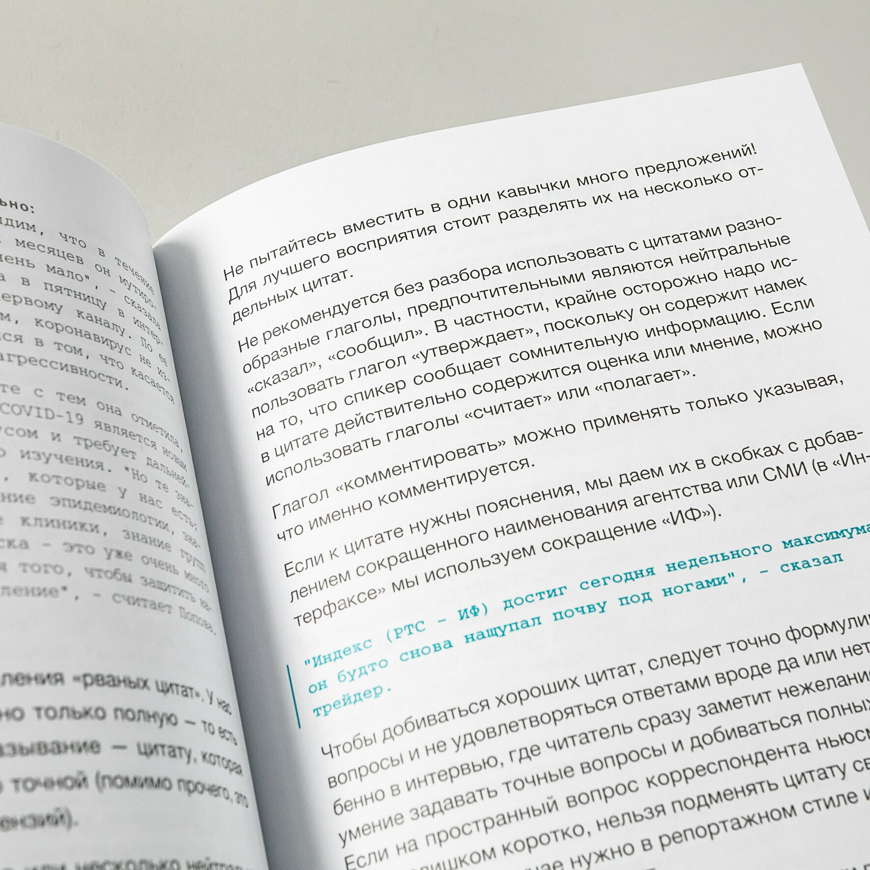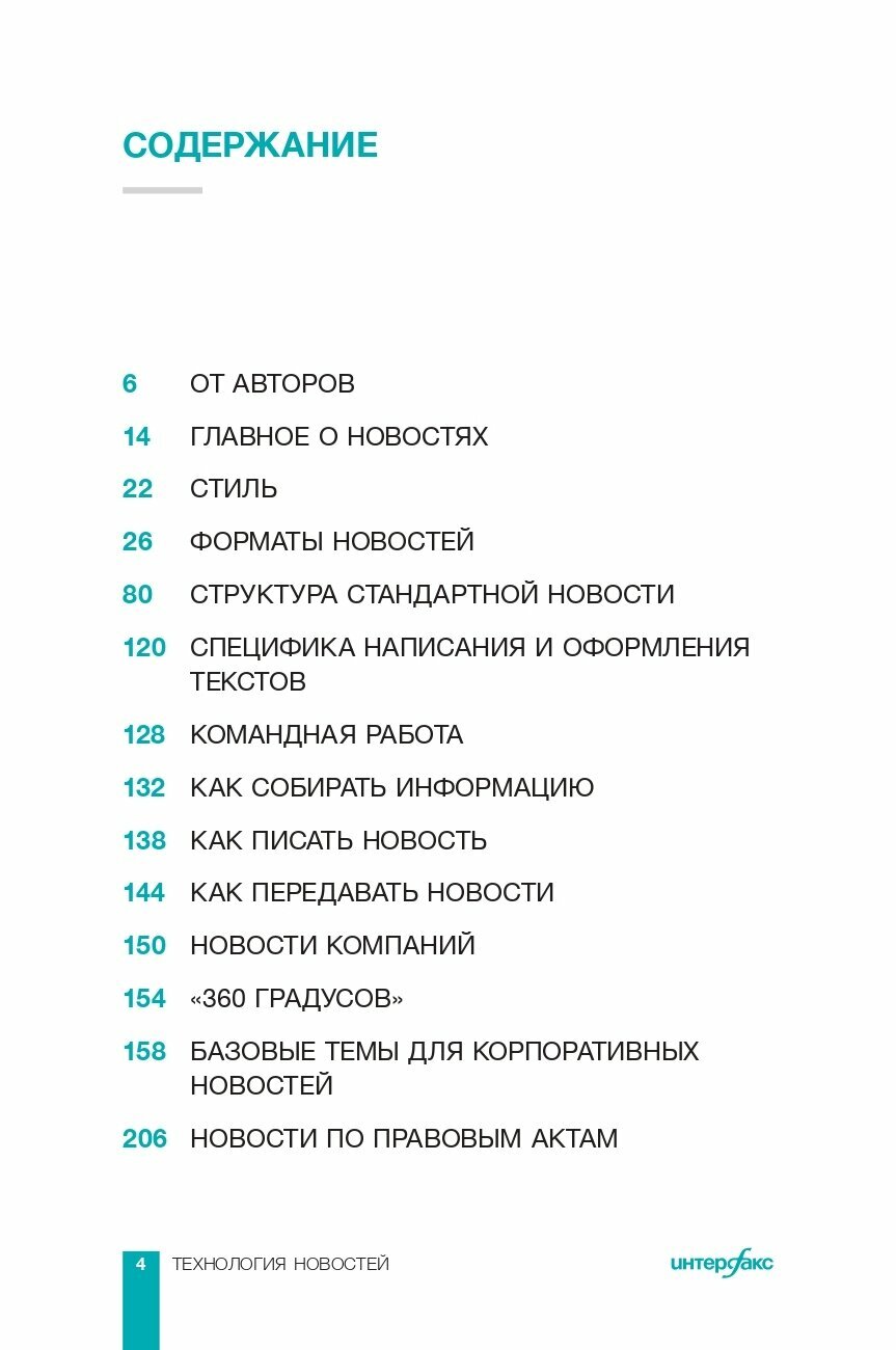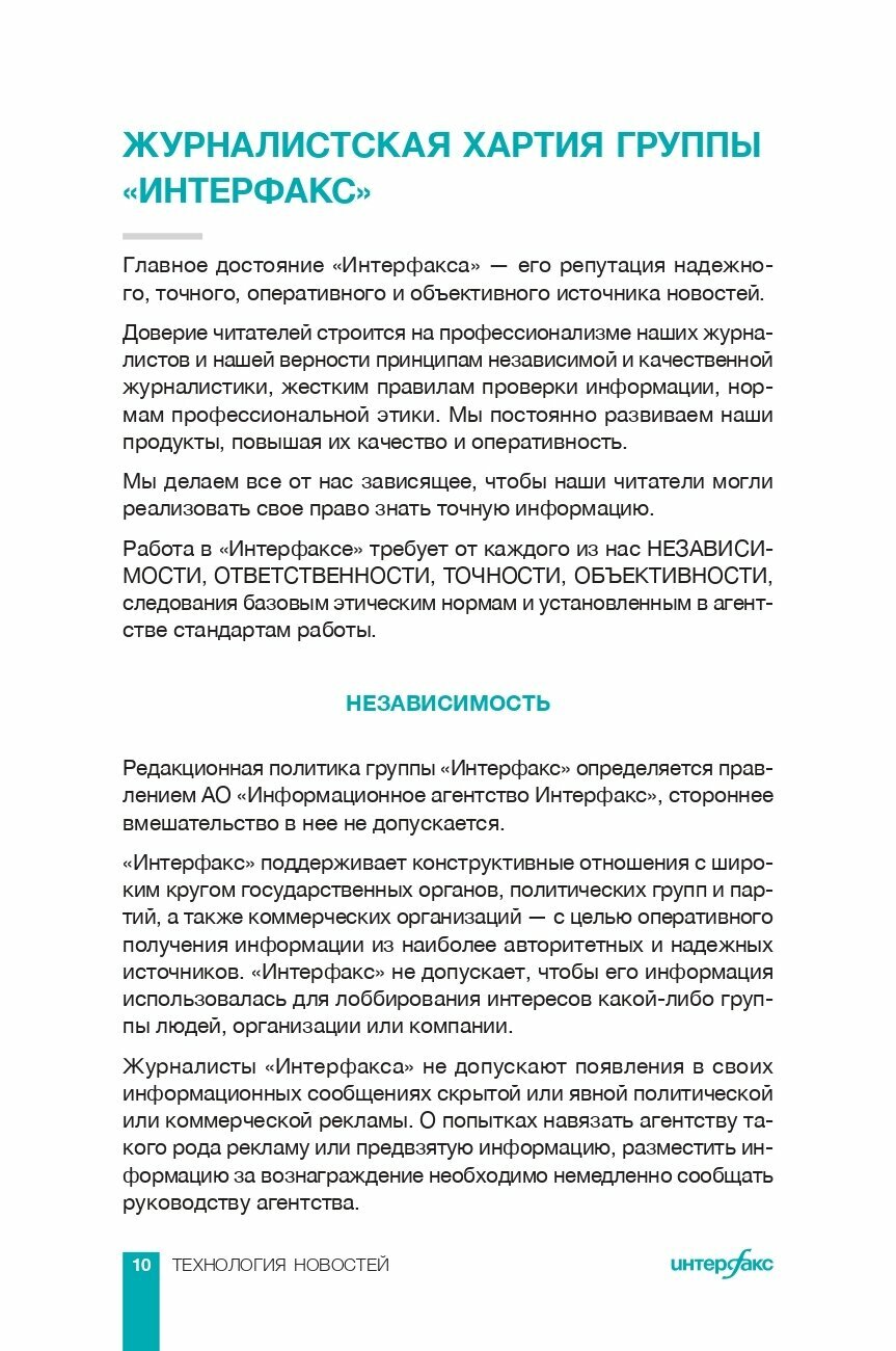 «Интерфакс. Технология новостей» создавалась в течение 30 лет как рабочие правила стиля и служебные инструкции для корреспондентов и редакторов агентства. Публикуя эту книгу, «Интерфакс» передает свой золотой стандарт новостной журналистики всем, кто хочет профессионально работать с информацией. Издание содержит подробный анализ структуры новостных сообщений, детальное описание жанров оперативной журналистики, объясняет специфику подготовки и написания информационных материалов, помогая избежать ошибок. Здесь можно найти пошаговые инструкции по освещению ключевых новостных поводов как общенационального характера, так и конкретных корпоративных событий. Также в книге дается практический анализ правового поля, в котором действуют российские журналисты.