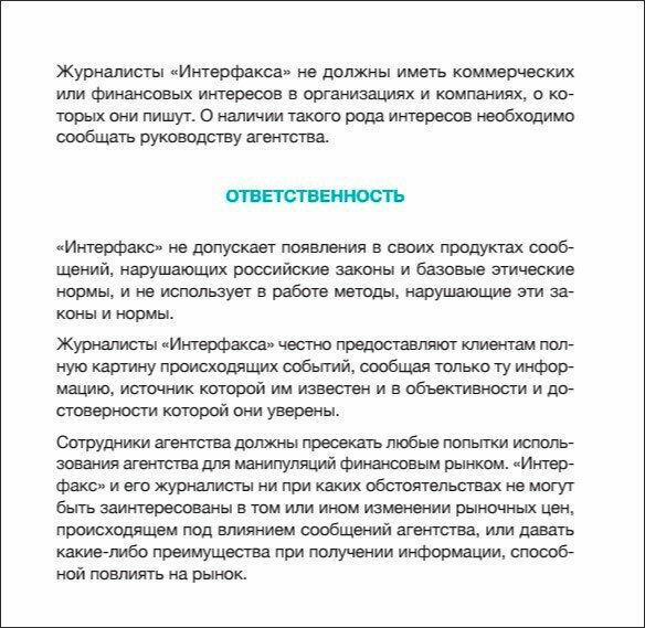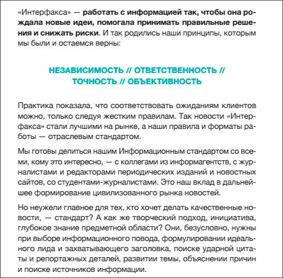 Из издания вы узнаете о фундаментальных принципах и подходах, которые позволили «Интерфаксу» стать лидером на российском рынке, о приемах командной работы, позволяющих информагентству действовать в жестком режиме реального времени и постоянно фокусироваться на самом важном.