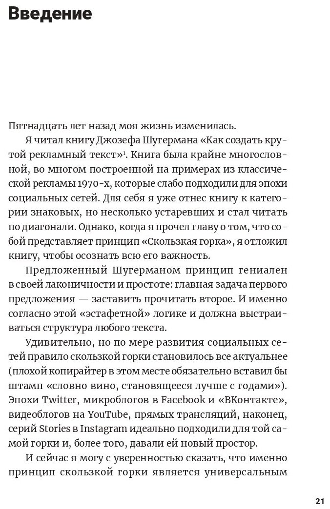 И именно техники сторителлинга позволяют преодолеть главное препятствие социальных сетей: «Все, что может быть не прочитано (а ровно и не просмотрено, не прослушано), — будет не прочитано». Так считает Дамир Халилов, один из ведущих специалистов по SMM в России. В своей книге он рассказывает о методе скользкой горки и других универсальных техниках сторителлинга, которые используют в своей практике лучшие писатели, сценаристы, а также опытные специалисты по рекламе. Эта книга научит читателя создавать захватывающий, запоминающийся контент для Instagram, TikTok, YouTube и других социальных сетей, а также получать от него максимальную отдачу в виде лояльных подписчиков, охватов, монетизации.