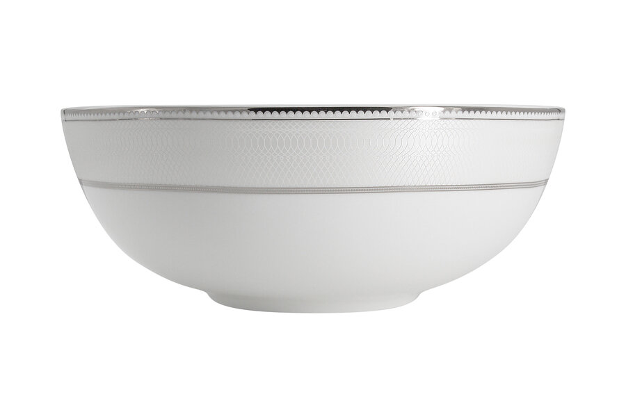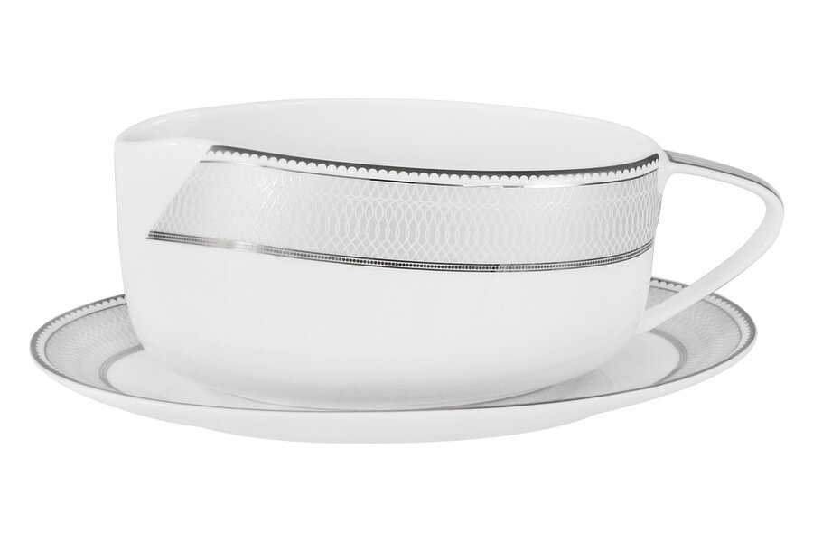 Серия Жемчуг отличается молочно-белой глянцевой поверхностью и перламутровым сиянием. Геометричный узор из переплетённых линий и серебряная обводка по краю придают предметам коллекции благородный и при этом необычный вид.