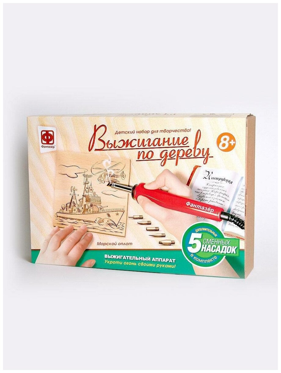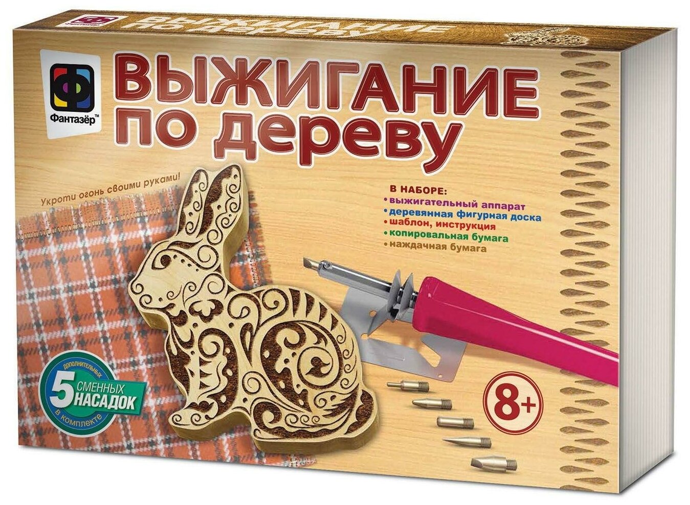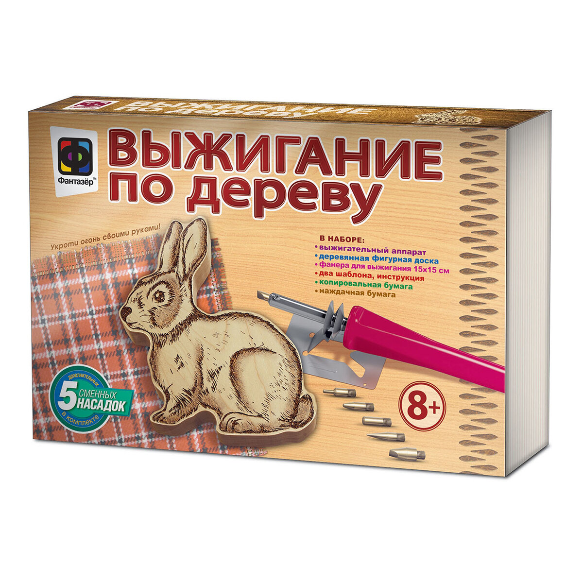 В набор входит: выжигательный аппарат со сменными насадками (5 штук), фигурная деревянная доска, фанера 15х15 см для выжигания, наждачная и копировальная бумага, шаблон, инструкция.