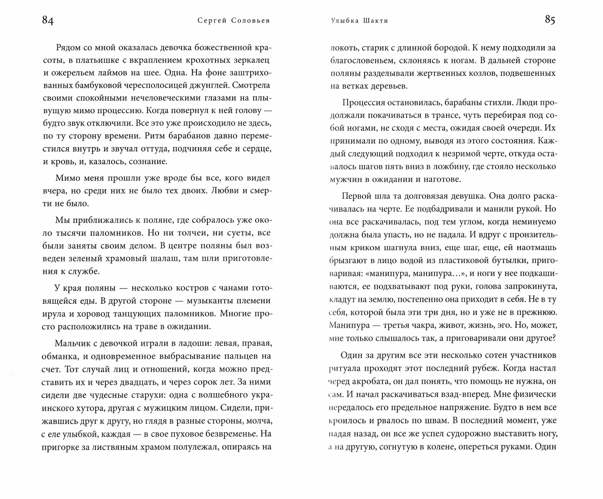 Роман, но без ядра, вокруг которого он обычно закручивается. Человек, но не тот, которым обжита отечественная литература. Индия, но не та, которую мы ожидаем. Любовь и обжигающая близость, но через них - стремление к иному. Сложная интеллектуальная оптика при безоглядной, как в детстве, открытости. Рай метафор, симфоническое письмо с неуловимой сменой регистров. Джунгли, тигры, слоны, экстремальный опыт, буддийские пещеры, жизнь с отшельниками, сад санскрита, трансовые мистерии, встреча с королем лесных племен, суфийское кружение речи между Западом и Востоком, но сквозь эту романтическую экзотику - путь к истоку, мерцающему родству с миром. Миром, который начался и пришел в движение от улыбки Шакти. Путь этот драматичен и чудесен. Одиссея письма, плывущая туда, где сторонятся слов. Сергей Соловьев - поэт, один из ярких представителей метареализма. Родился в Киеве, живет в Мюнхене, последние 17 лет путешествует по Индии. Прозу автора относят к так называемому интенсивному письму, в котором "текст затягивает - а потом смыслы и ассоциации ветвятся, расширяются - и чтение приостанавливается само собой, причем закладку хочется поместить не между страницами, а между предложениями. Или между словами" (А. Уланов). "Улыбка Шакти", оставаясь отдельной книгой, составляет с повестью "Аморт" (2005) и романом "Адамов мост" (2013) своего рода трилогию.