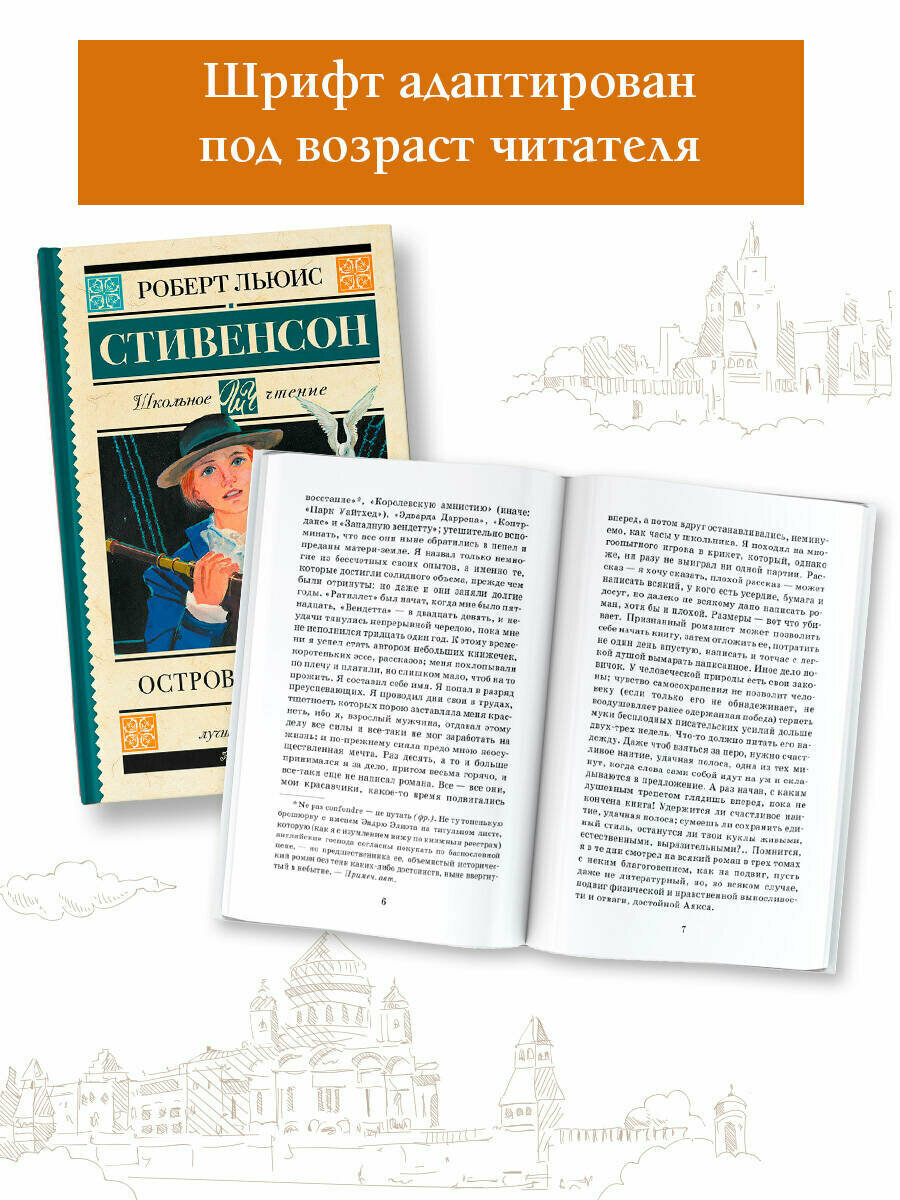 Прекрасная книга в одной из любимых серий для школьников от АСТ! Плотная бумага, хороший шрифт, качественная печать, полностью отсутствуют орфографические ошибки. Как в лучших книгах из нашего детства, в этом издании есть вступление от автора и даже словарь морских терминов, которые точно не будут понятны современным детям без пояснений. Ну и, конечно, гениальный текст Стивенсона не нуждается в моей оценке. Очень рекомендую, будем и дальше с сыном собирать библиотеку классики в этой серии.