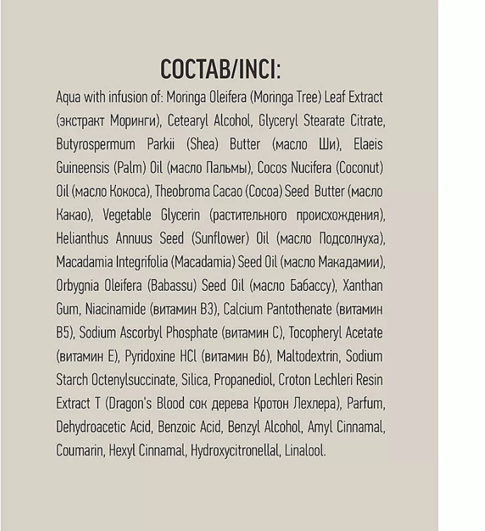 В составе крема — масла кокоса, макадамии, бабассу и ши. Они глубоко питают кожу, устраняют сухость и повышают эластичность.
