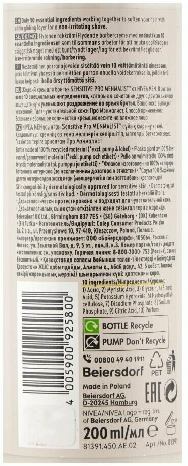 На сегодняшний день товар «Крем жидкий для бритья Sensitive Pro Men Menmalist Nivea/Нивея 200мл Beiersdorf AG Польша (2101464)» можно купить с кешбеком в 1 магазине: Яндекс.Маркет