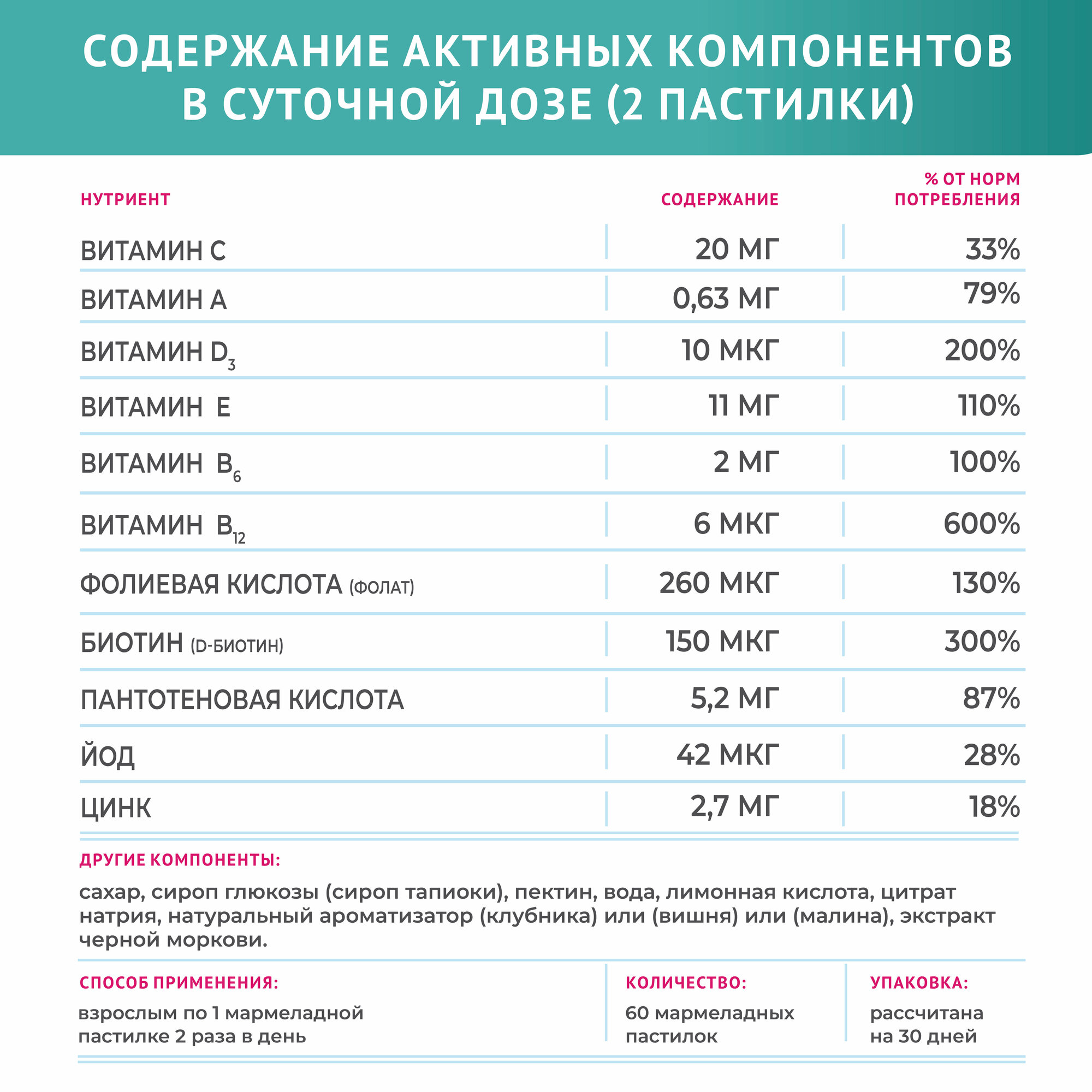 | Состав | тростниковый сахар, сироп глюкозы (сироп тапиоки), вода, пектин, лимонная кислота (регулятор кислотности), цитрат натрия (регулятор кислотности), L-аскорбиновая кислота (витамин С), ароматизатор (крем-сода), DL-альфа-токоферола ацетат (витамин E), экстракт черной моркови, цитрат цинка, холекальциферол (витамин D3), D-пантотенат кальция (витамин В5), ретинола ацетат (витамин А), пиридоксина гидрохлорид (витамин B6), фолиевая кислота (фолат), D-биотин, бета каротин (краситель), холина битартрат, калия йодид, инозит, цианокобаламин (витамин B12). |