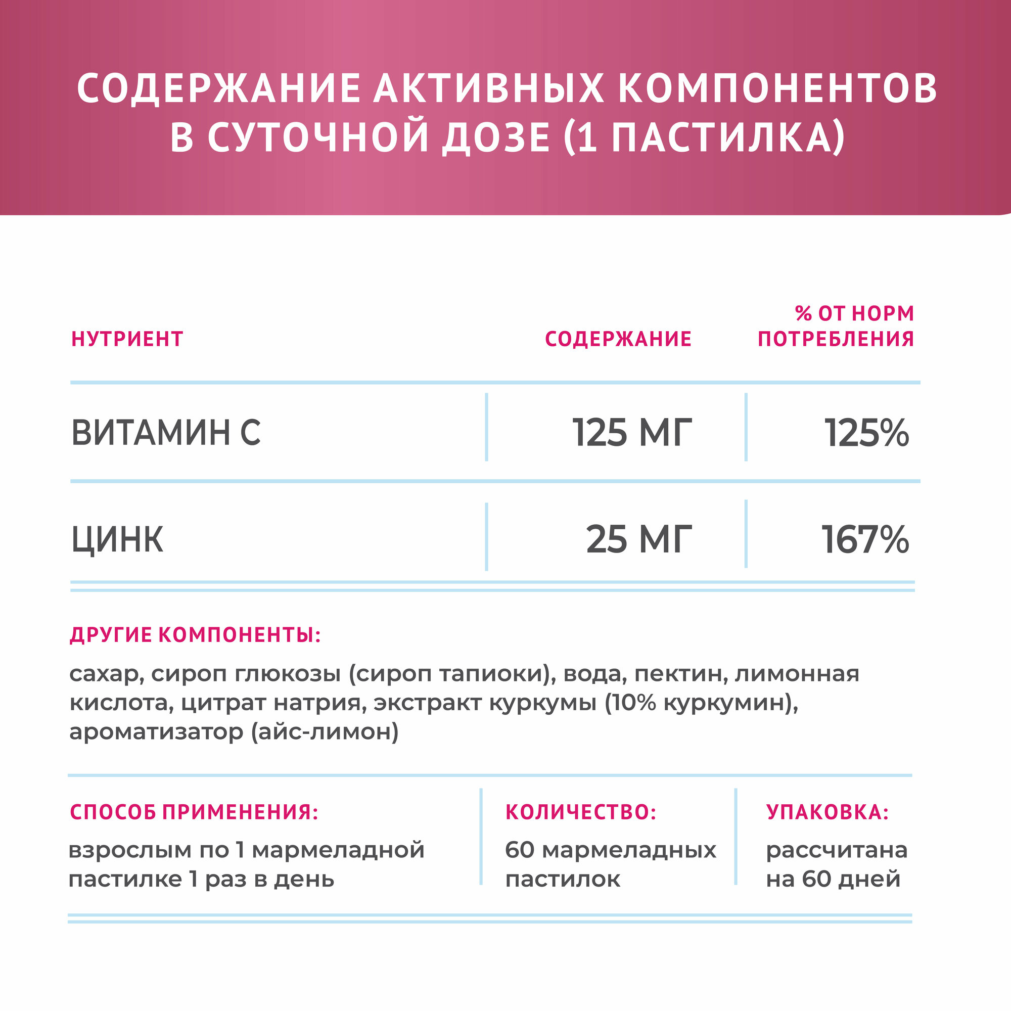 | Состав | тростниковый сахар, сироп глюкозы (сироп тапиоки), вода, L-аскорбиновая кислота (витамин С), цитрат цинка, пектин, лимонная кислота (регулятор кислотности), цитрат натрия (регулятор кислотности), экстракт куркумы (10% куркумин), ароматизатор (айс-лимон). |