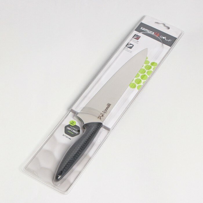Нож Samura Golf Шеф - - кухонный нож с тонким лезвием из высокотехнологичной коррозионностойкой стали AUS 8. Двусторонняя заточка острых ножей SAMURA GOLF привлекает своим удобством. Легкий вес, оптимальный баланс формы и содержания “ложится под любую руку”.