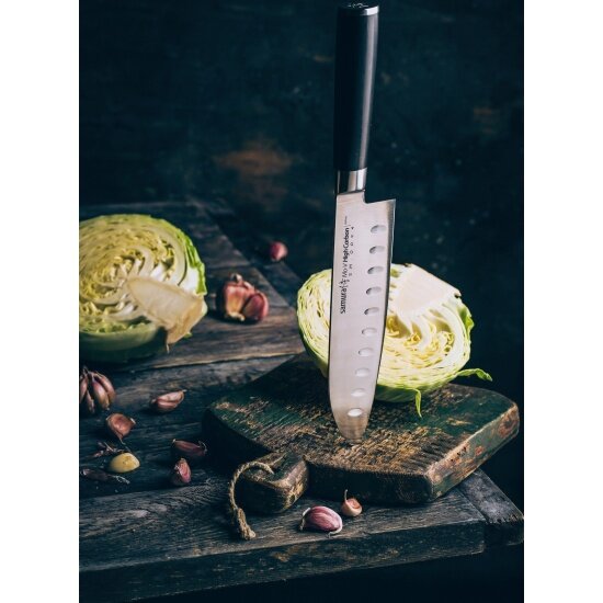Большой сантоку из коллекции MO-V с широким массивным клинком из однослойной стали – идеальный нож для нарезки, шинковки и рубки продуктов. А ещё с помощью его обуха очень удобно пересыпать с разделочной доски нарезанные кусочки овощей или мяса. На клинке над режущей кромкой расположен ряд овальных выемок. Они выполняют роль воздушных карманов, уменьшая площадь соприкосновения с продуктом. Так предотвращается раздражающее и мешающее работе налипание пищи на лезвие. В общем-то, благодаря такой особенности все манипуляции выполняются легко и быстро. Профессиональный нож Mo-V становится поистине спасением для повара!